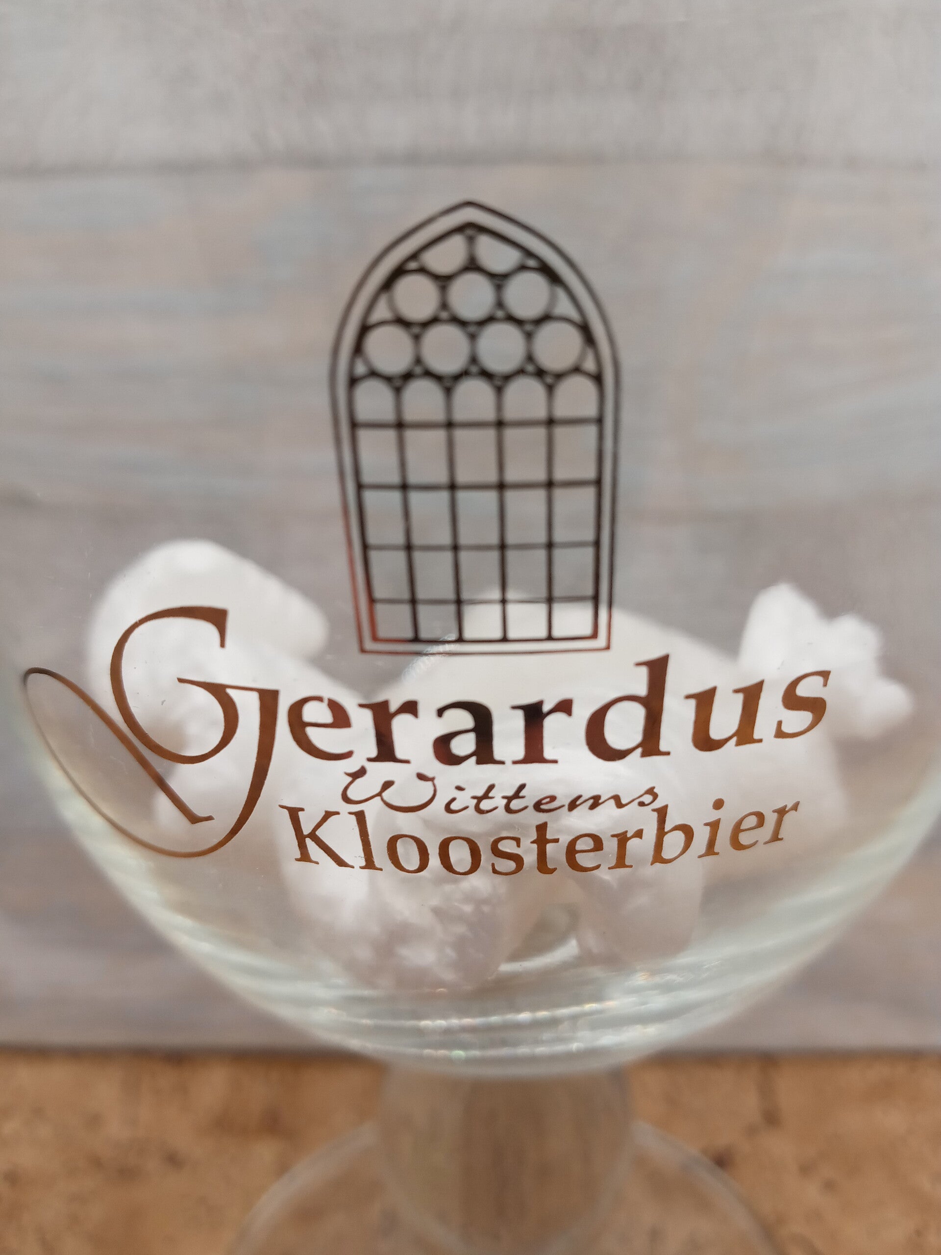 Bicchiere birra Gerardus Wittems Kloosterbier in vetro, calice a forma di coppa con stelo basso e bombato della capacità di 33 cl. Altezza cm 15,5. Diametro apertura cm 9,5. Diametro base cm 8.