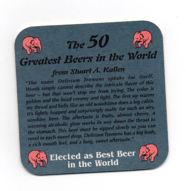 Sottobicchiere birra Delirium Tremens, in cartoncino pressato monouso di forma quadrata. Dimensioni cm 9 per lato.