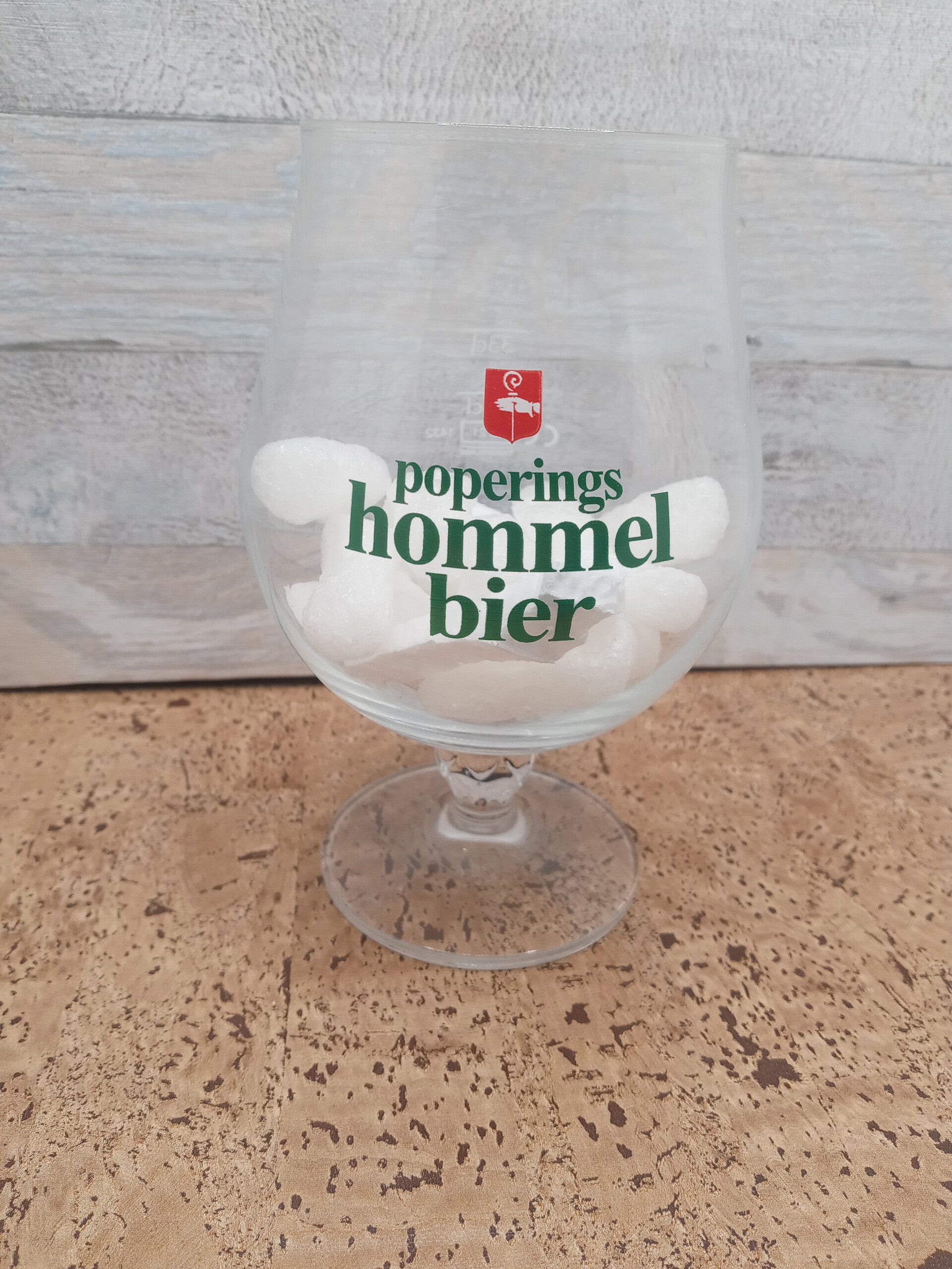 Bicchiere birra Hommel Bièr Poperings in vetro Tradyglass, calice a forma di coppa della capacità massima alla tacca di 33 cl. Altezza cm 14,5. Basso stelo a "pigna".