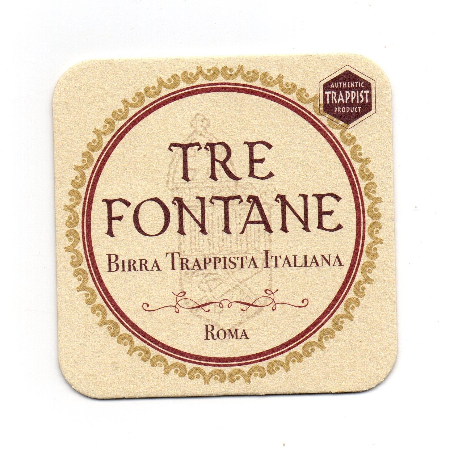 Sottobicchiere birra Tre Fontane, in cartoncino pressato monouso di forma quadrata. Dimensioni cm 9,5 per lato.