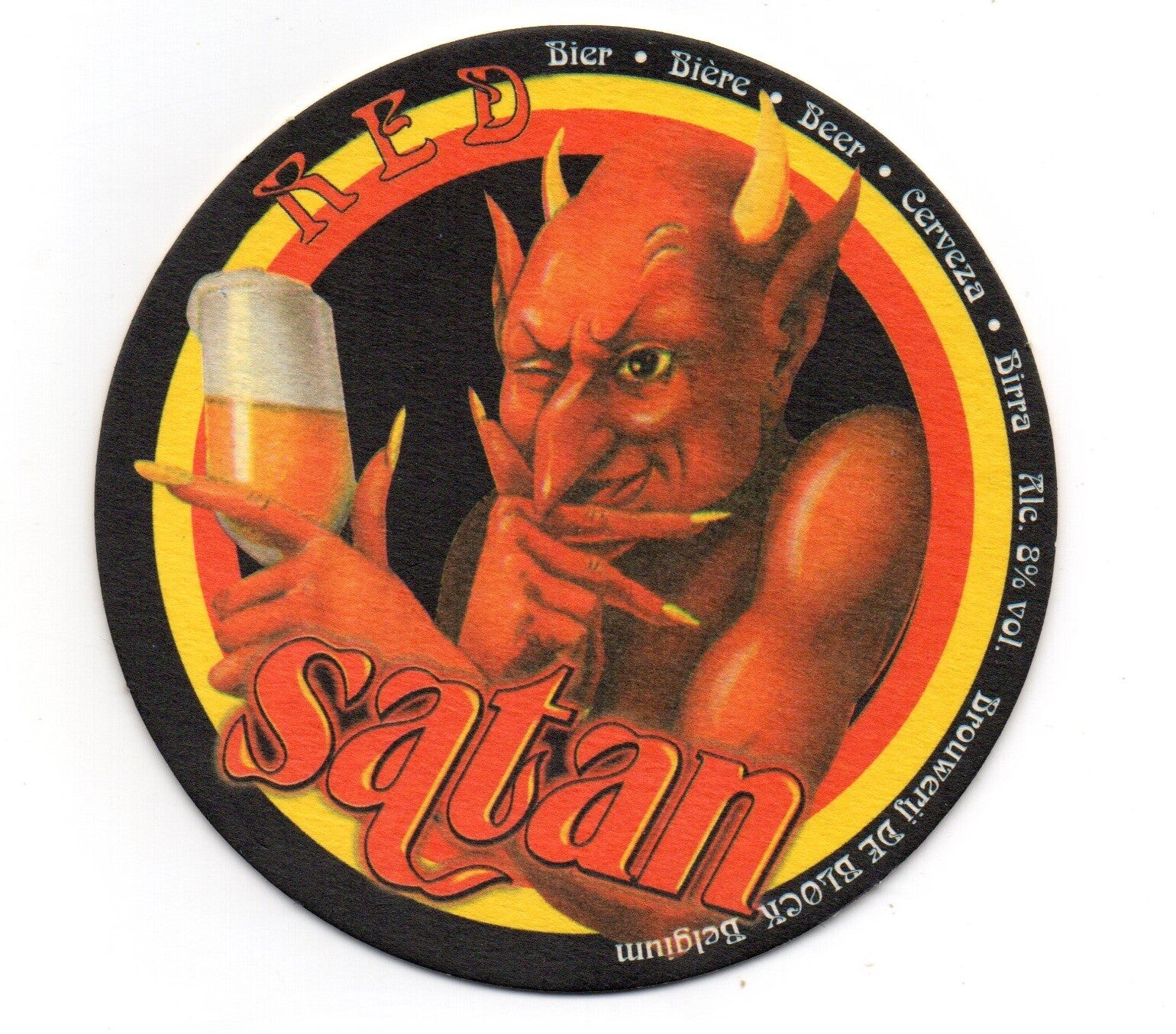 Sottobicchiere birra Satan, in cartoncino pressato monouso di forma rotonda. Diametro cm 11.