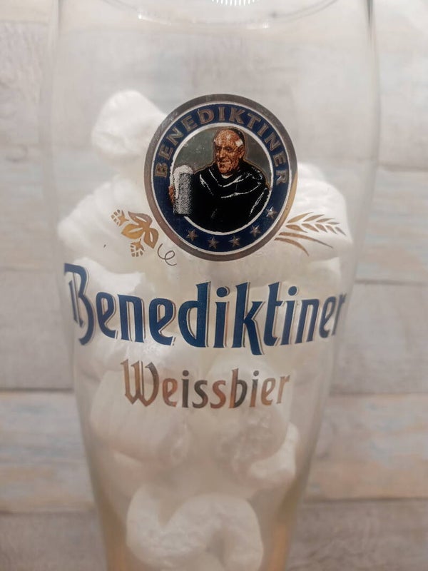 Bicchiere birra Benediktiner Weissbier, in vetro Rastal dalla tipica forma weizen tedesca della capacità alla tacca di 50 cl. Altezza cm 24,5.