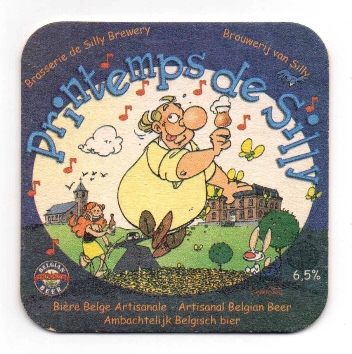 Sottobicchiere birra Printemps de Silly, in cartoncino pressato monouso di forma quadrata. Dimensioni cm 9 per lato.
