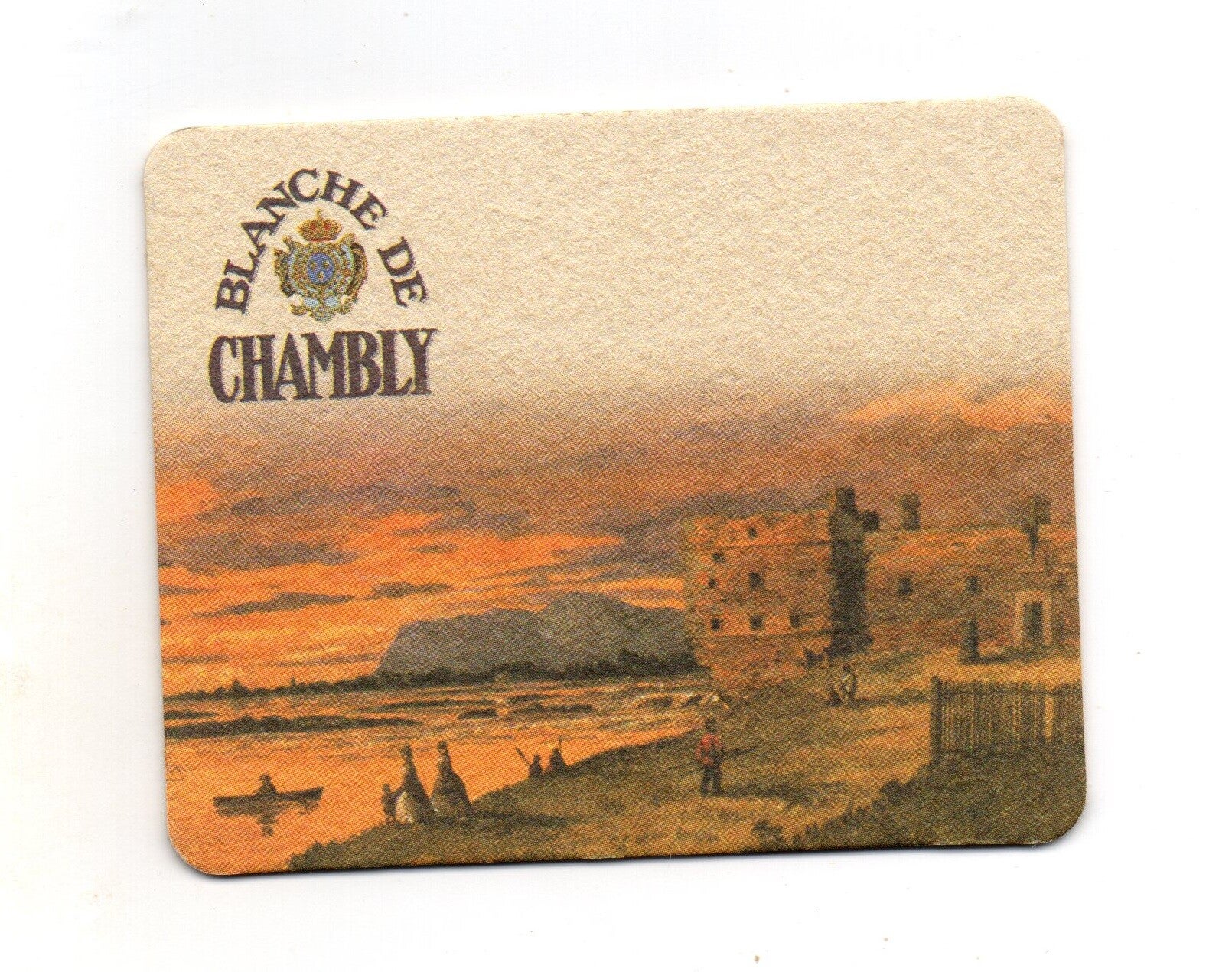 Sottobicchiere birra Blanche de Chambly, in cartoncino pressato monouso di forma rettangolare. Dimensioni cm 10 x 8.