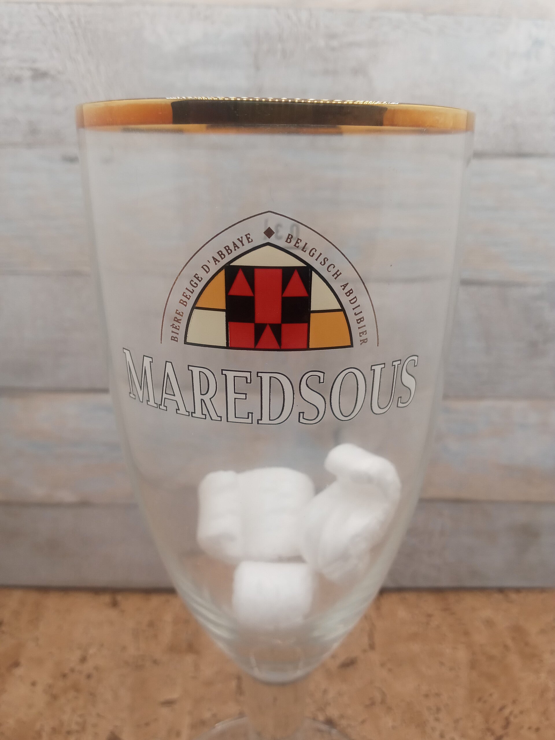 Bicchiere birra Maredsous Bière d'Abbaye - Abdij bier in vetro Rc, calice a forma di flute della capacità alla tacca di 30 cl. Altezza cm 21,5.