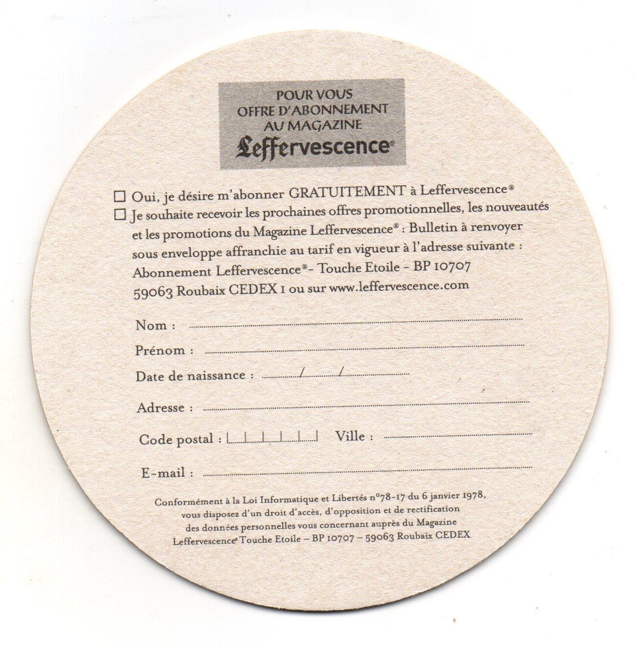 Sottobicchiere birra Leffe, in cartoncino pressato monouso di forma rotonda. Diametro cm 10.