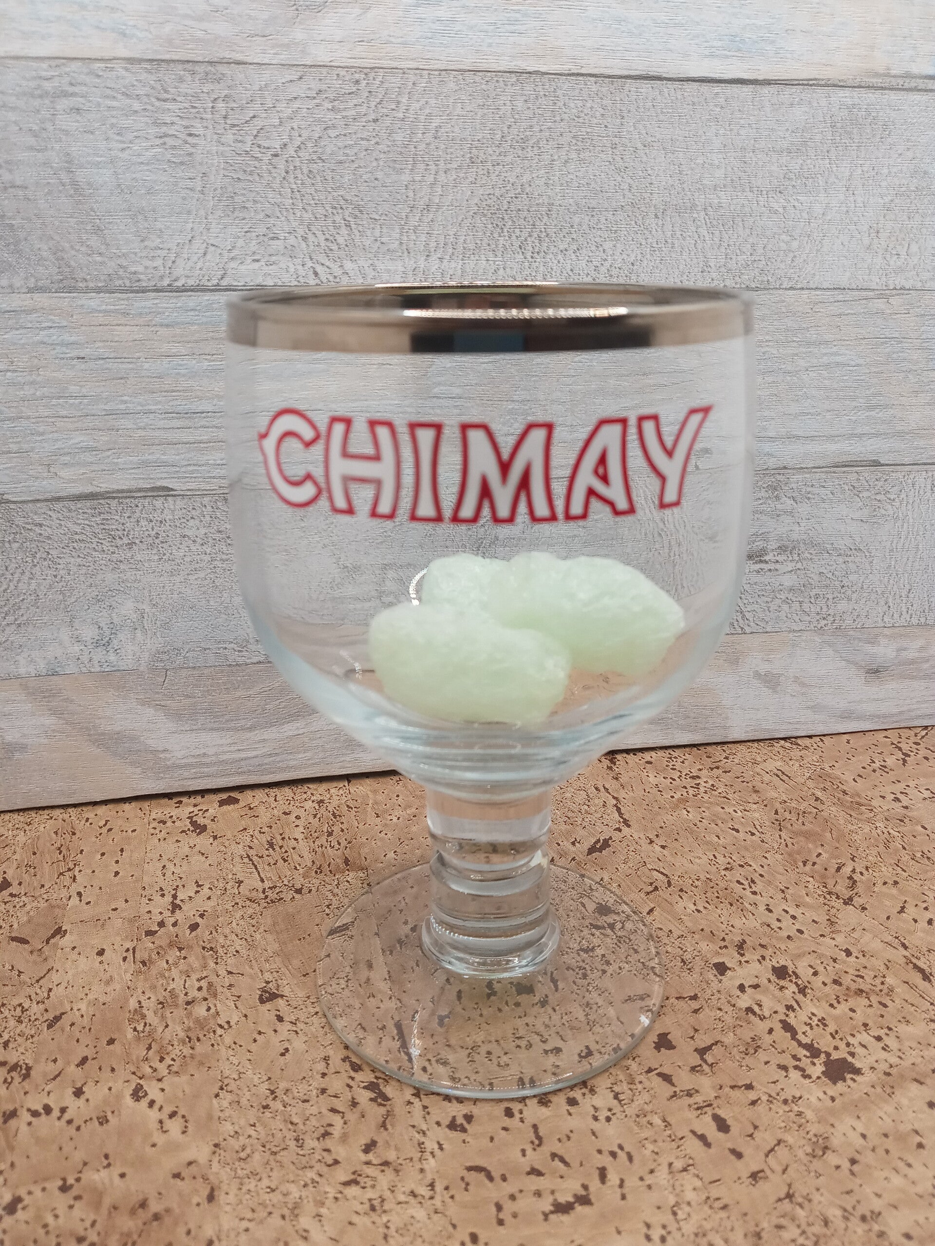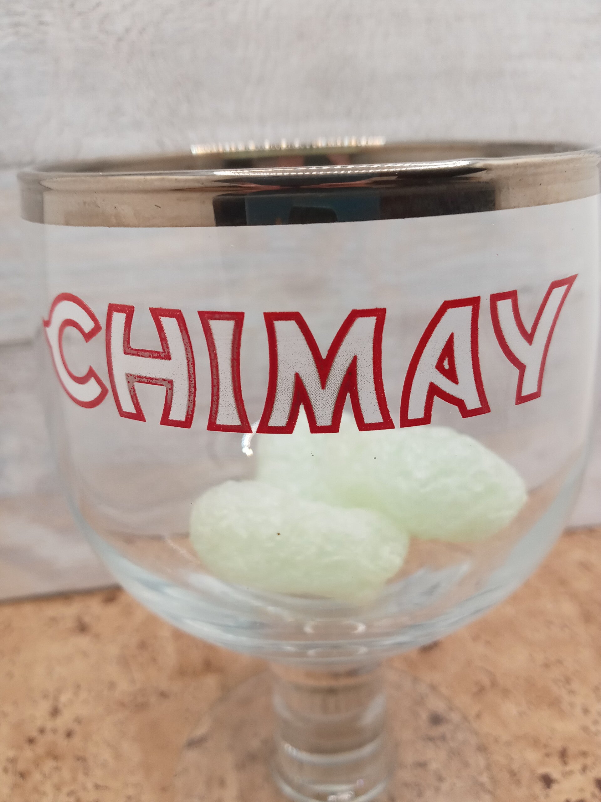 Bicchiere birra Chimay a forma di coppa con alto bordo argento in vetro dal tipico stelo a blocchi della capacità di 33 cl. Altezza cm 15.