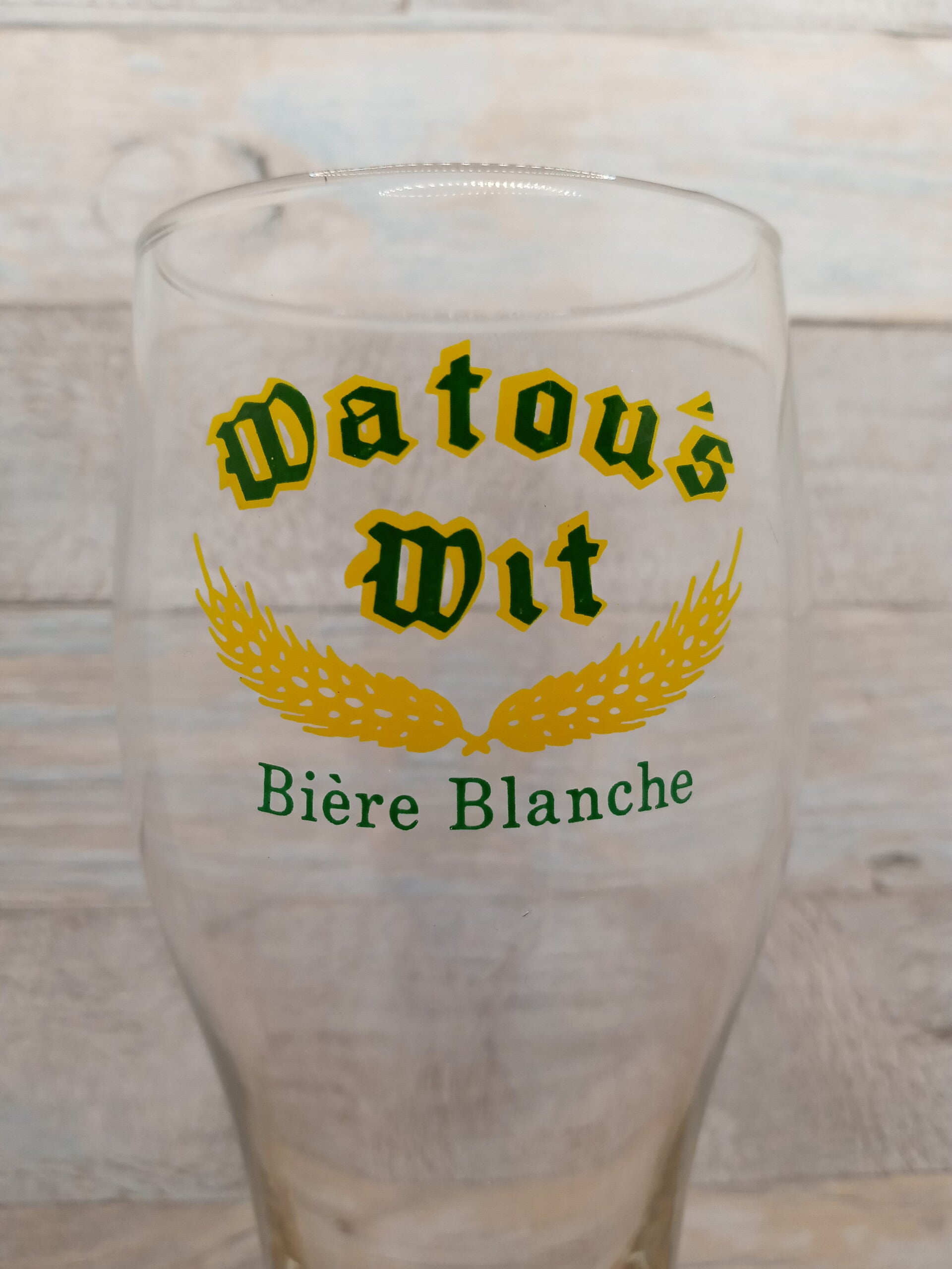 Bicchiere birra Watou's Wit Bière Blanche in vetro, a tipica forma weizen della capacità massima al bordo di 40 cl. Altezza cm 18,5.