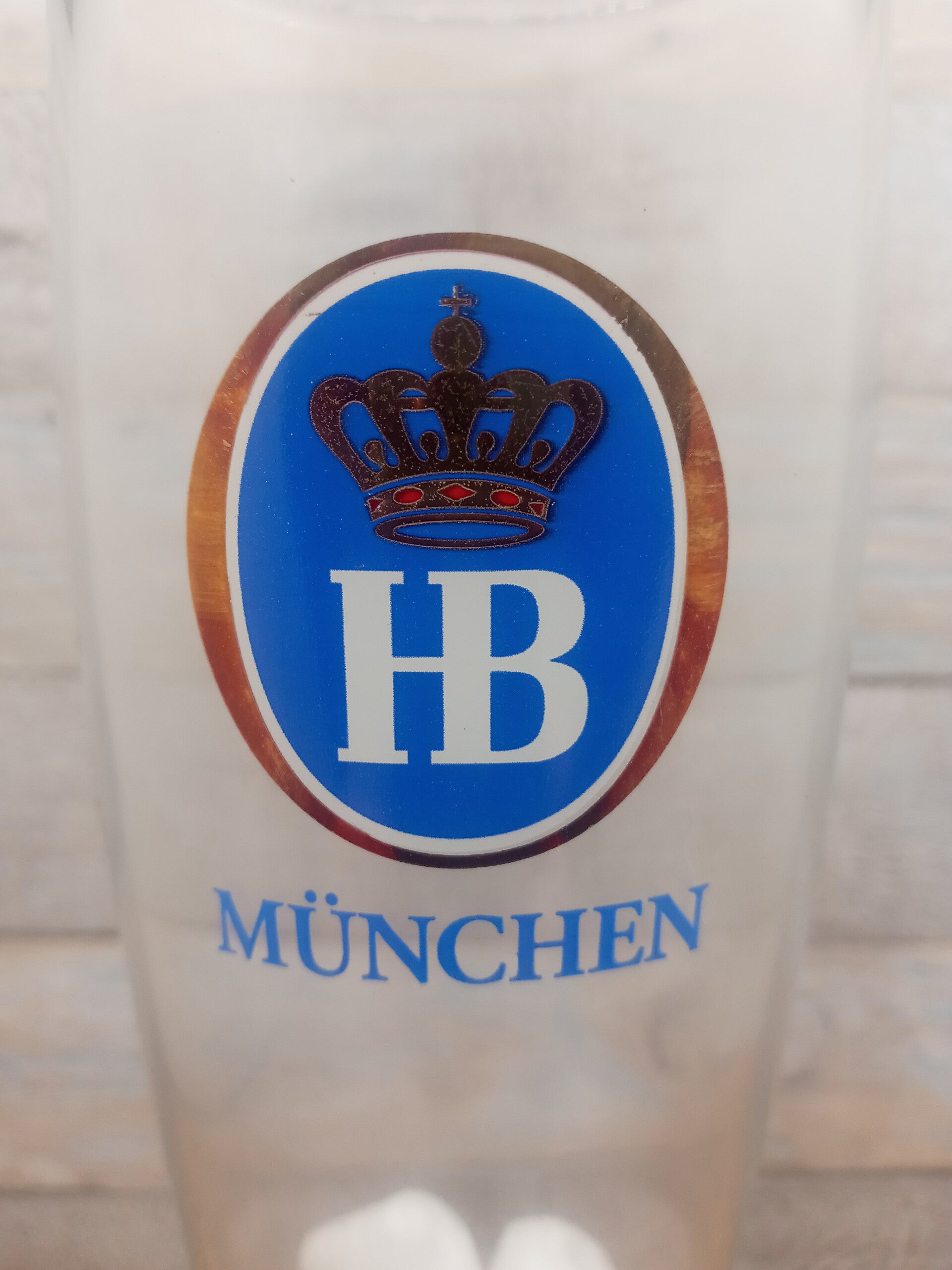 Bicchiere birra HB Munchen in vetro Sahm, dalla tipica forma Weizen tedesca della capacità alla tacca di 50 cl. Altezza cm 25.