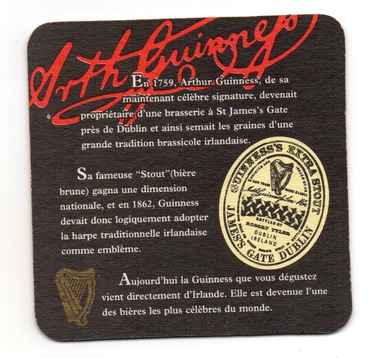 Sottobicchiere birra Guinness, in cartoncino pressato monouso di forma quadrata. Dimensioni cm 9 per lato.