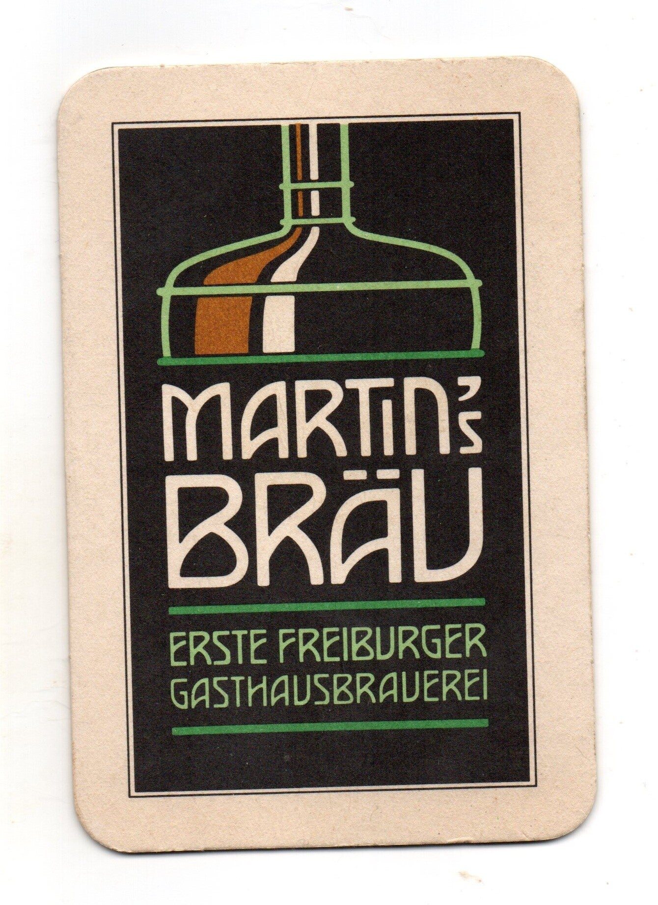 Sottobicchiere birra Martin's Brau, in cartoncino pressato monouso di forma rettangolare. Dimensioni cm 9 x 13,5.