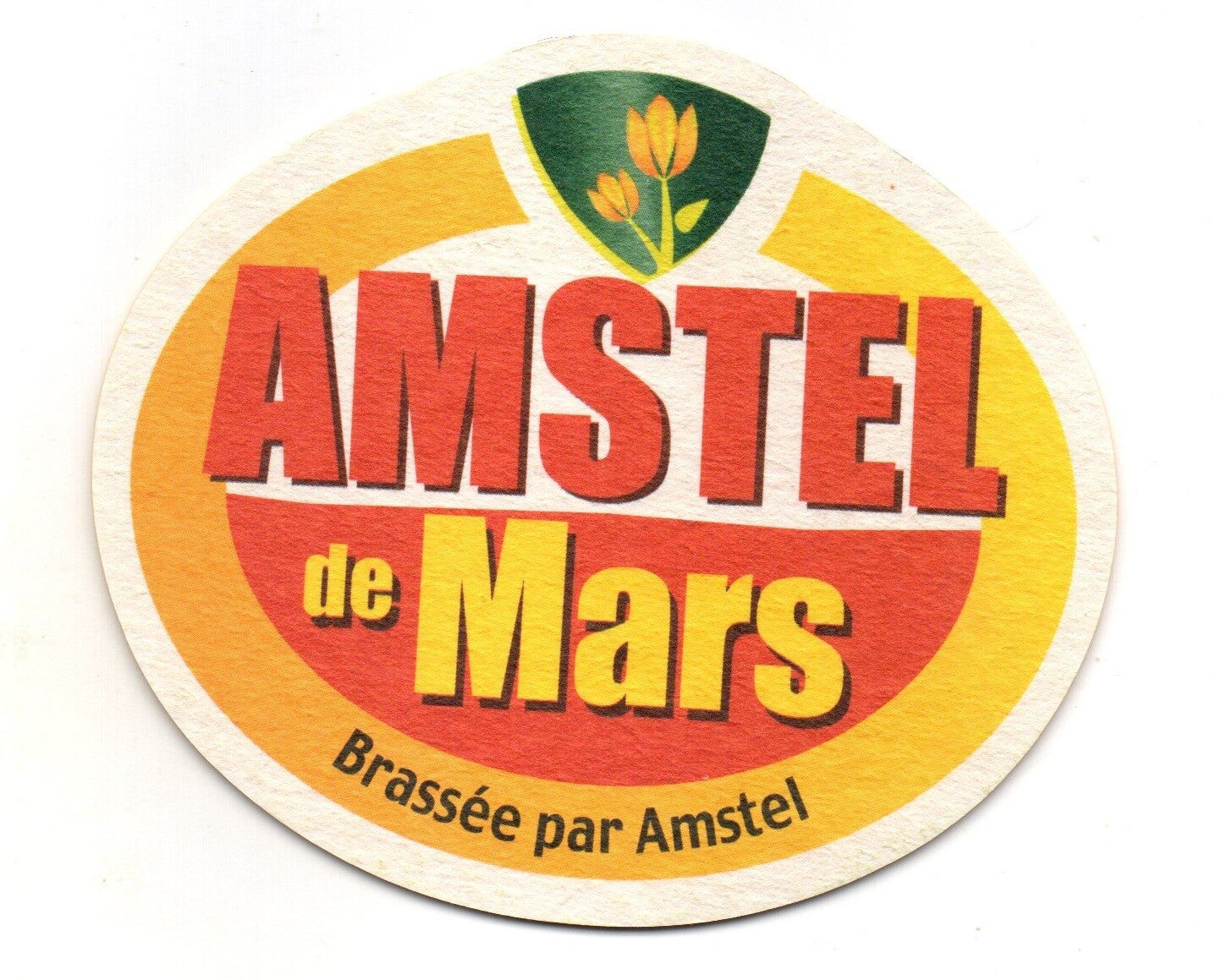 Sottobicchiere birra Amstel, in cartoncino pressato monouso di forma ovale. Dimensioni cm 10,5 x 9.