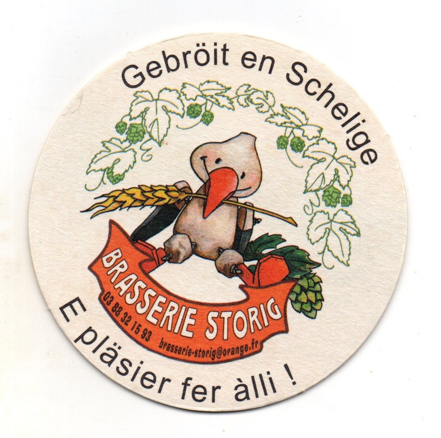 Sottobicchiere birra Brasserie Storig, in cartoncino pressato monouso di forma rotonda. Diametro cm 10,5.