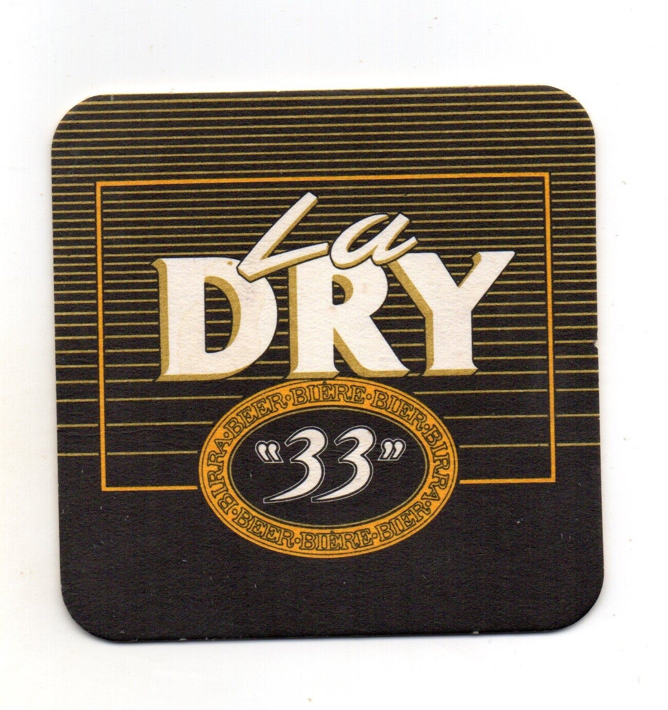 Sottobicchiere birra La Dry 33, in cartoncino pressato monouso di forma quadrata. Dimensioni cm 9 per lato.