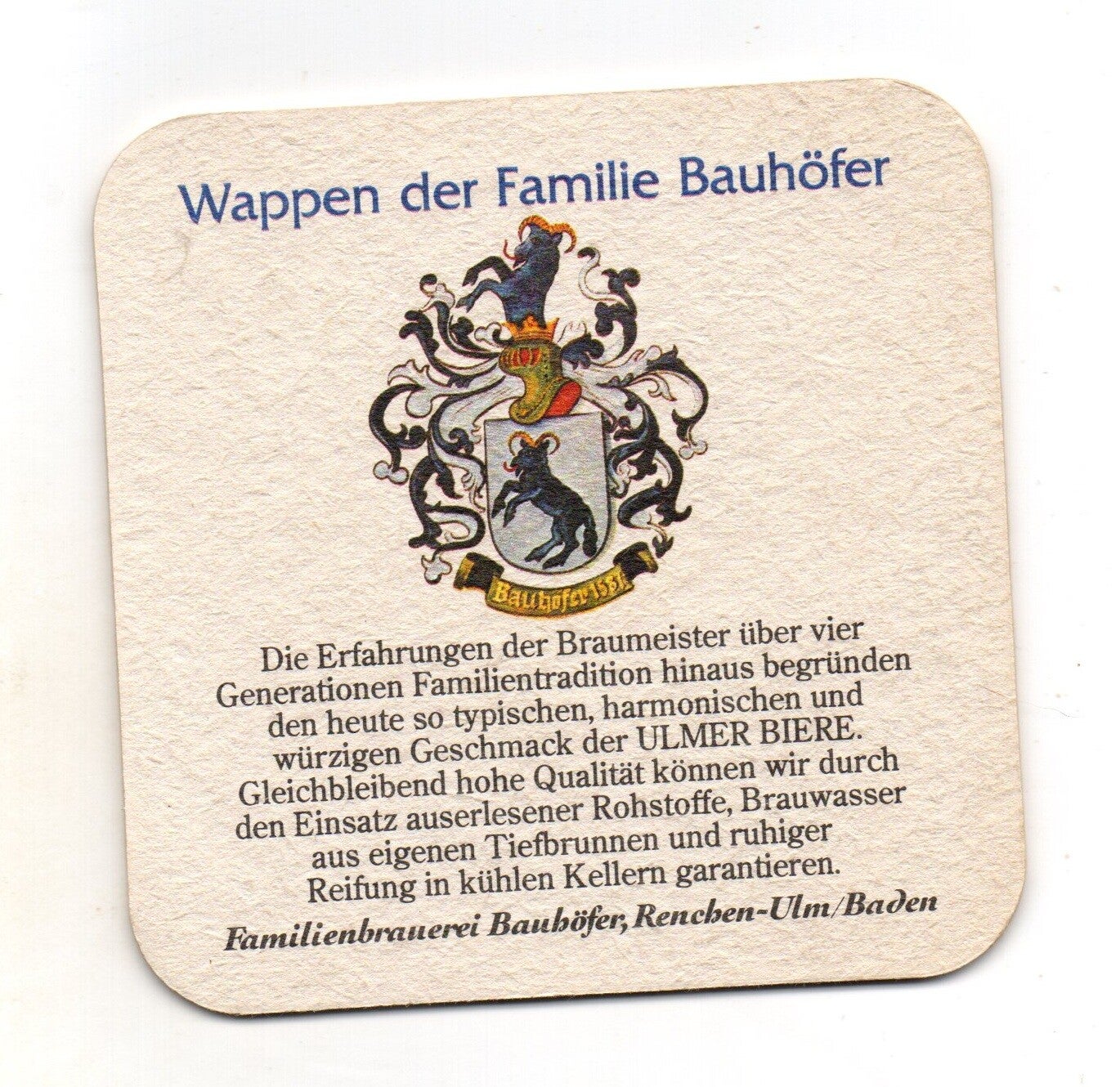 Sottobicchiere birra Ulmer, in cartoncino pressato monouso di forma quadrata. Dimensioni cm 9,5 per lato.