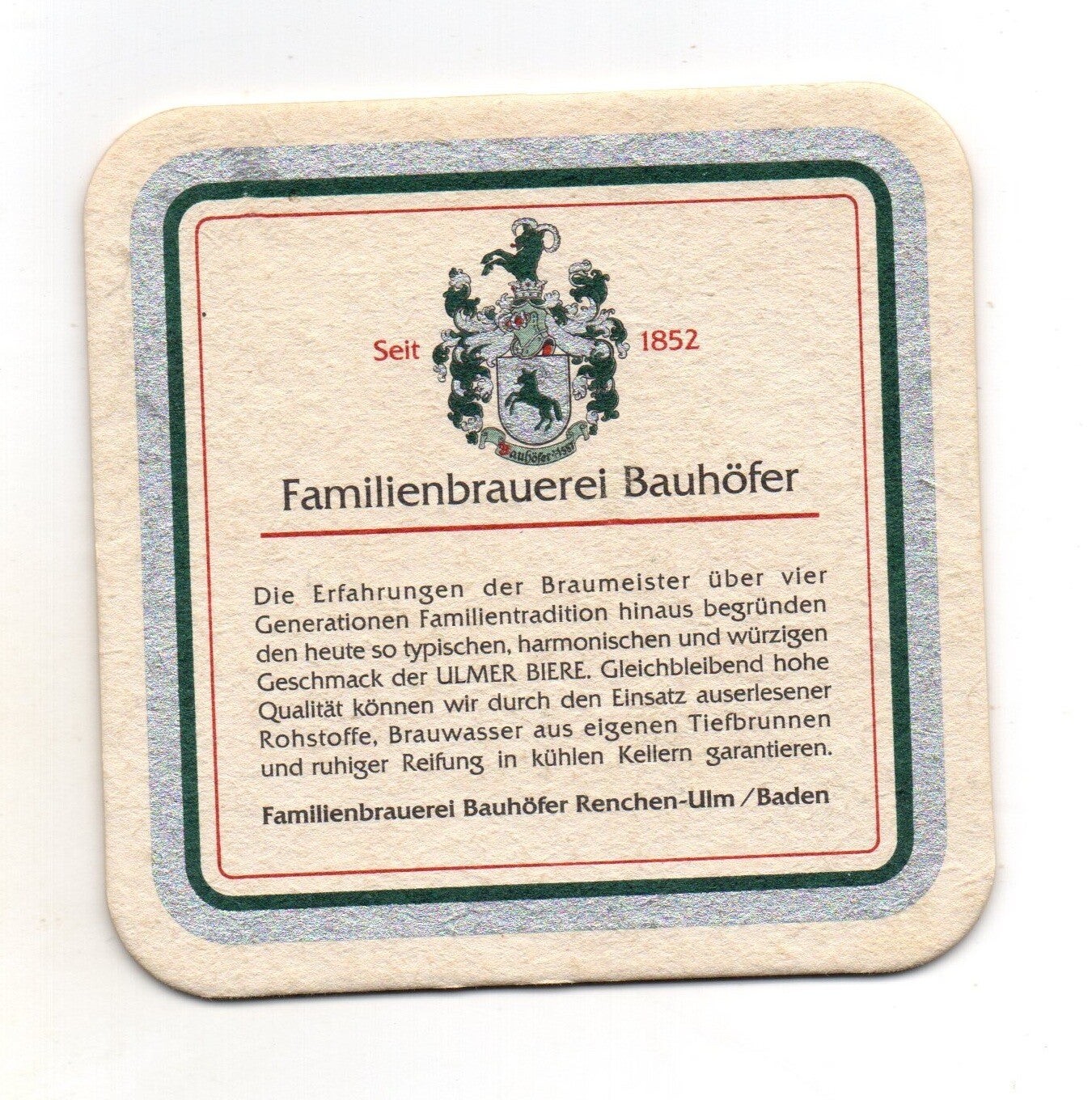 Sottobicchiere birra Ulmer Bier, in cartoncino pressato monouso di forma quadrata. Dimensioni cm 9,5 per lato.