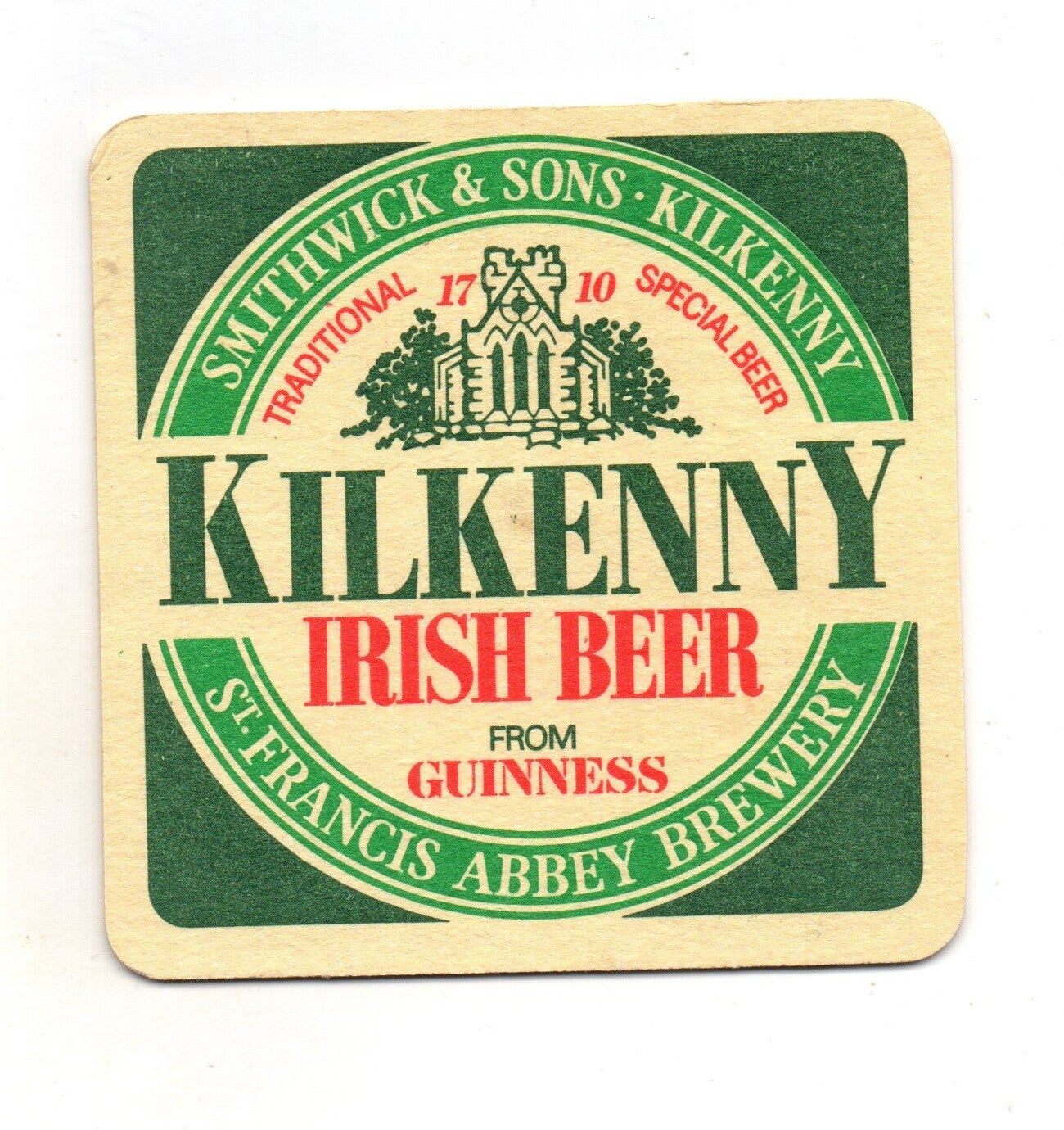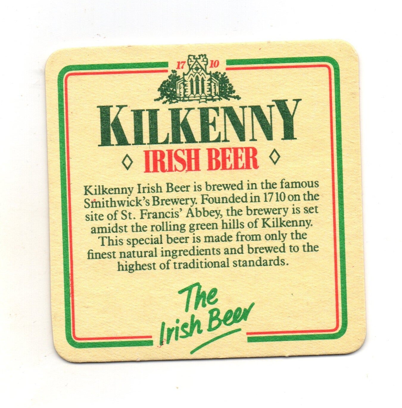 Sottobicchiere birra Kilkenny, in cartoncino pressato monouso di forma quadrata. Dimensioni cm 9 per lato.
