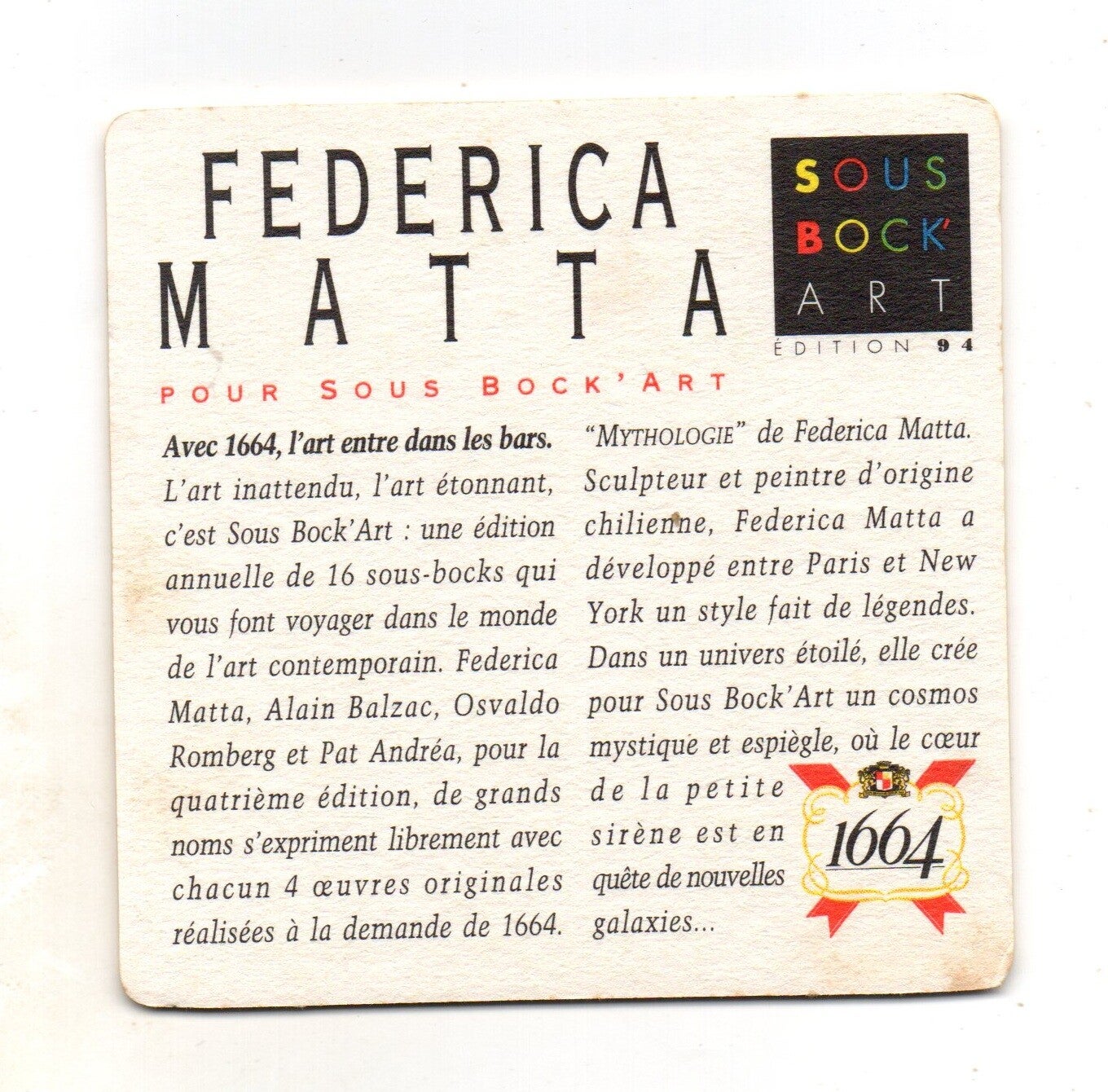 Sottobicchiere birra Kronenbourg, in cartoncino pressato monouso di forma quadrata. Dimensioni cm 9,5 per lato.
