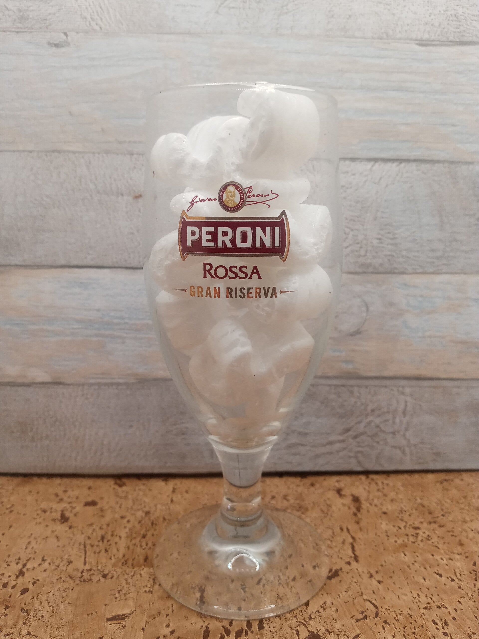 Bicchiere birra Peroni Gran Riserva Rossa in vetro, calice a forma di flute della capacità alla tacca di 20 cl. Altezza cm 16,5.