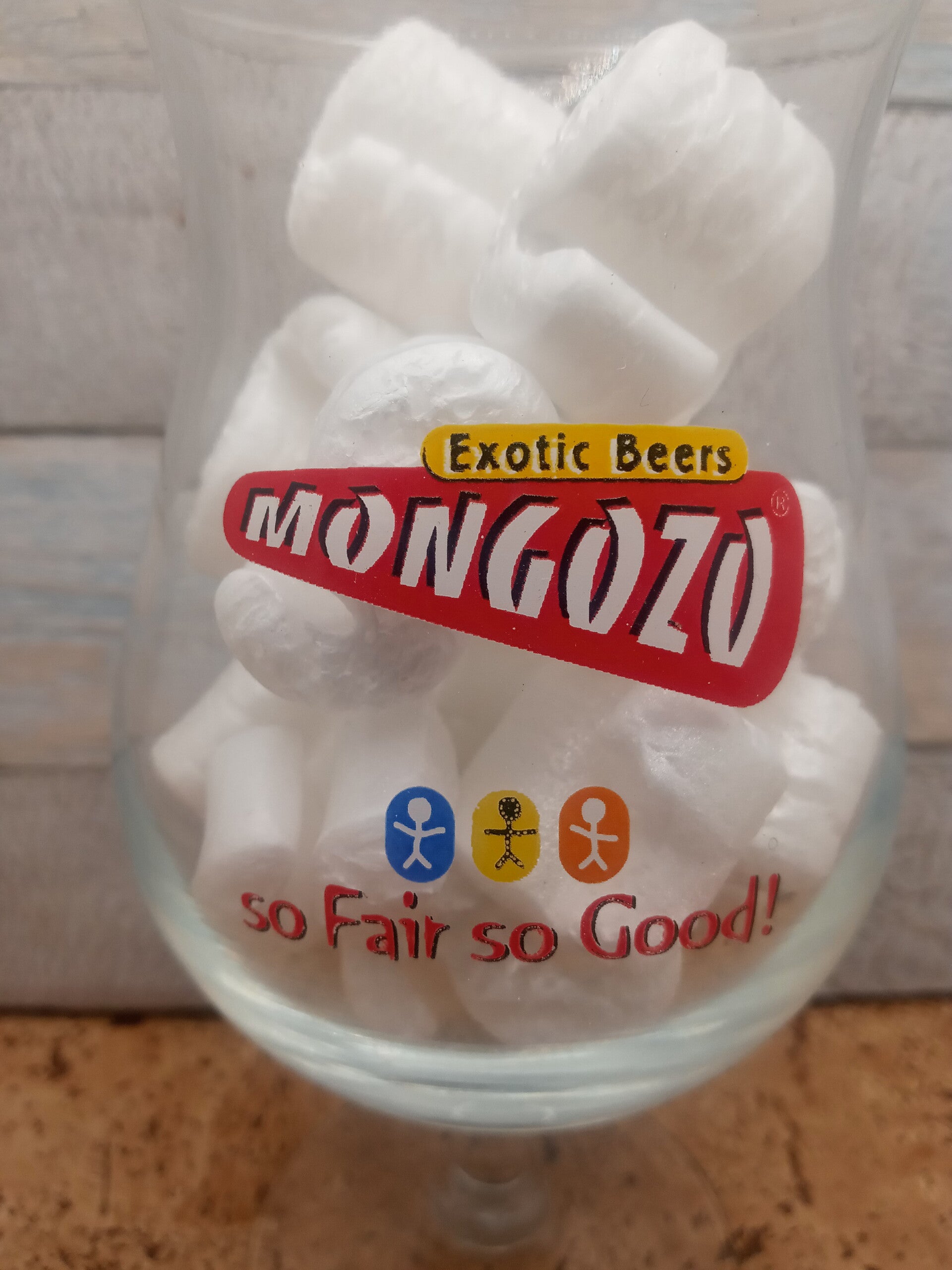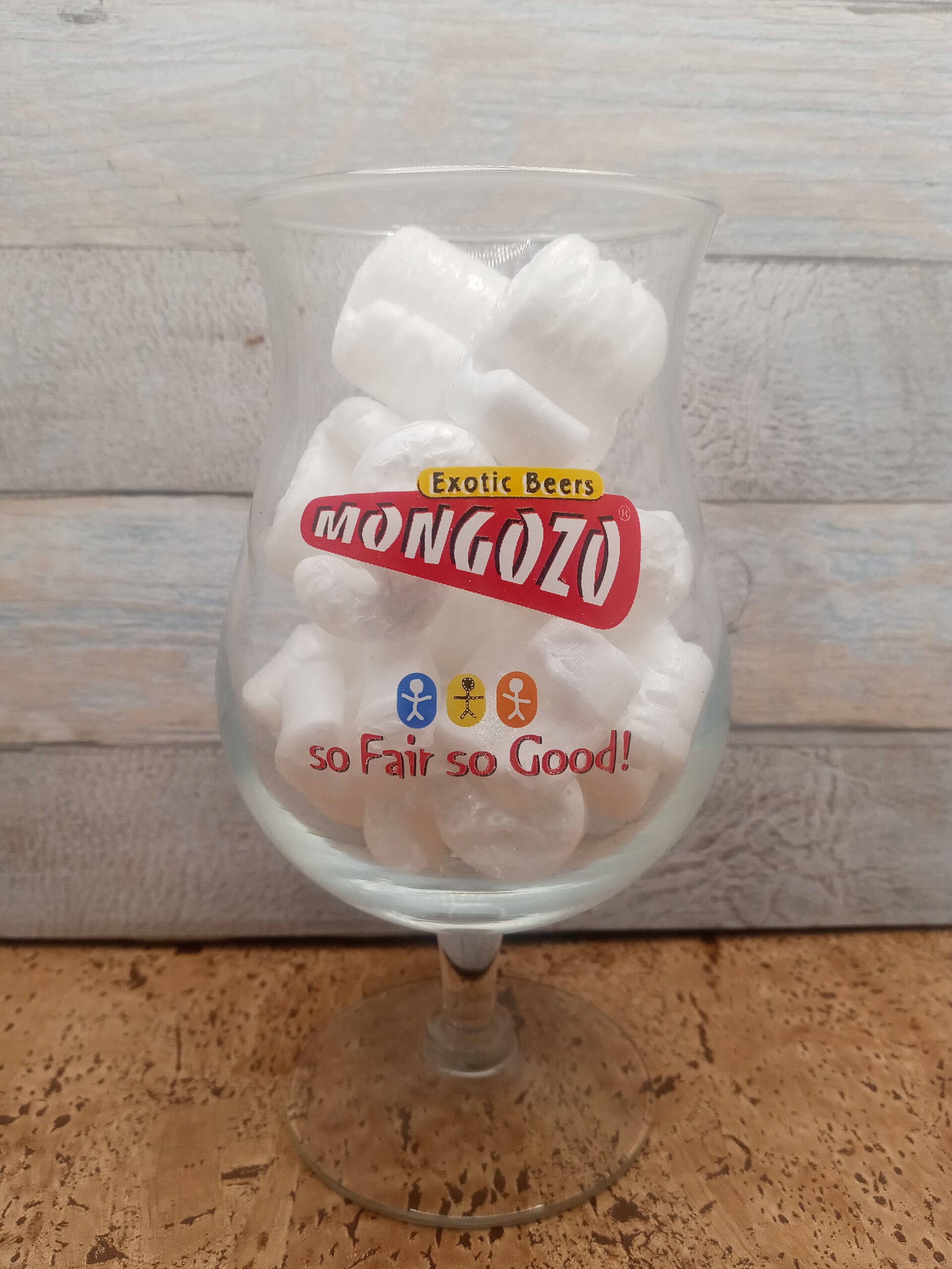Bicchiere birra Mongozo Exotic Beers in vetro, calice a forma di tulipano della capacità alla tacca di 25 cl. Altezza cm 15,5.