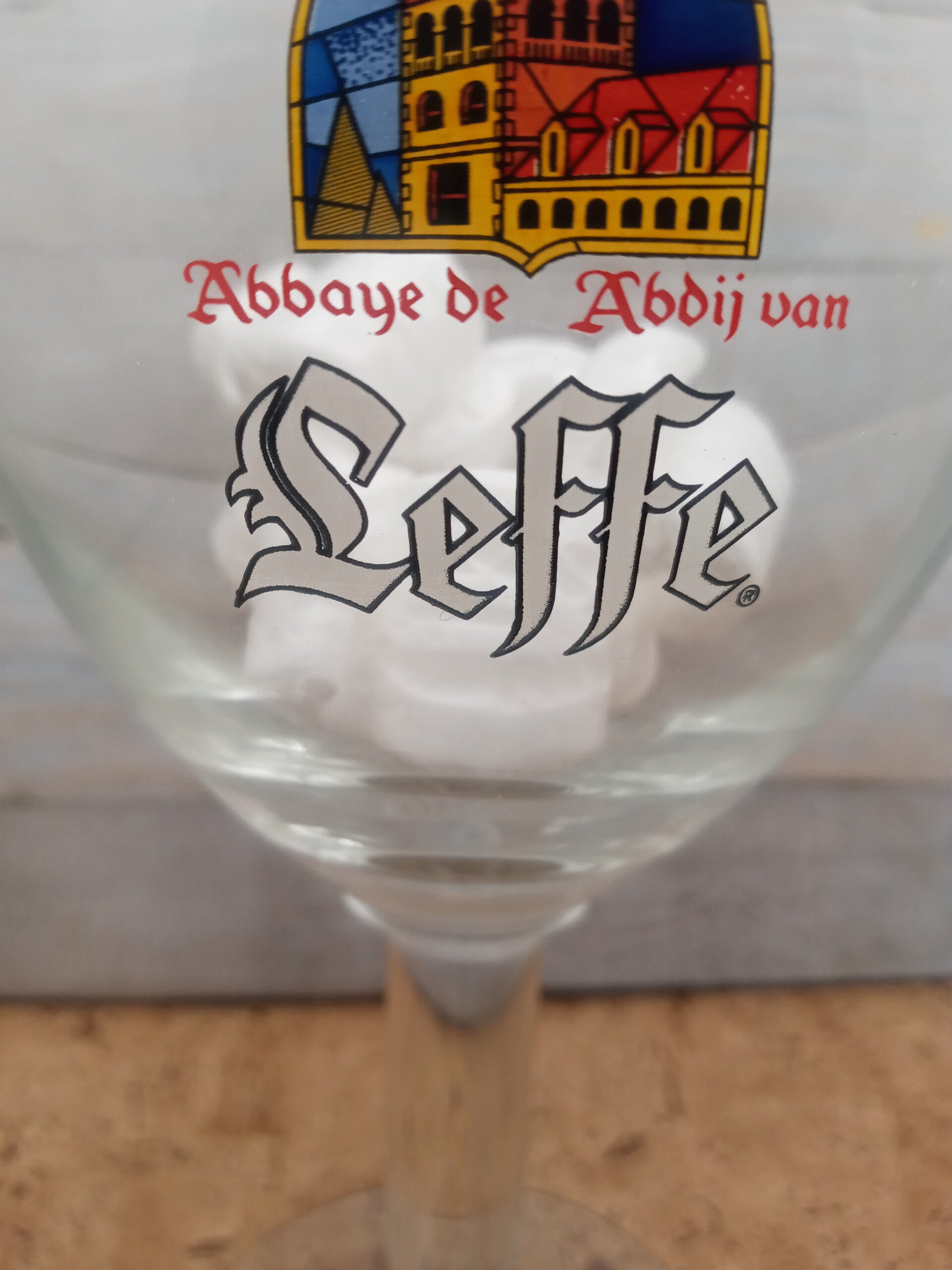 Sul davanti compare a forma di scudo l'immagine dell'Abbazia con la scritta Abbaye de Abdij van Leffe. Lo stelo è liscio