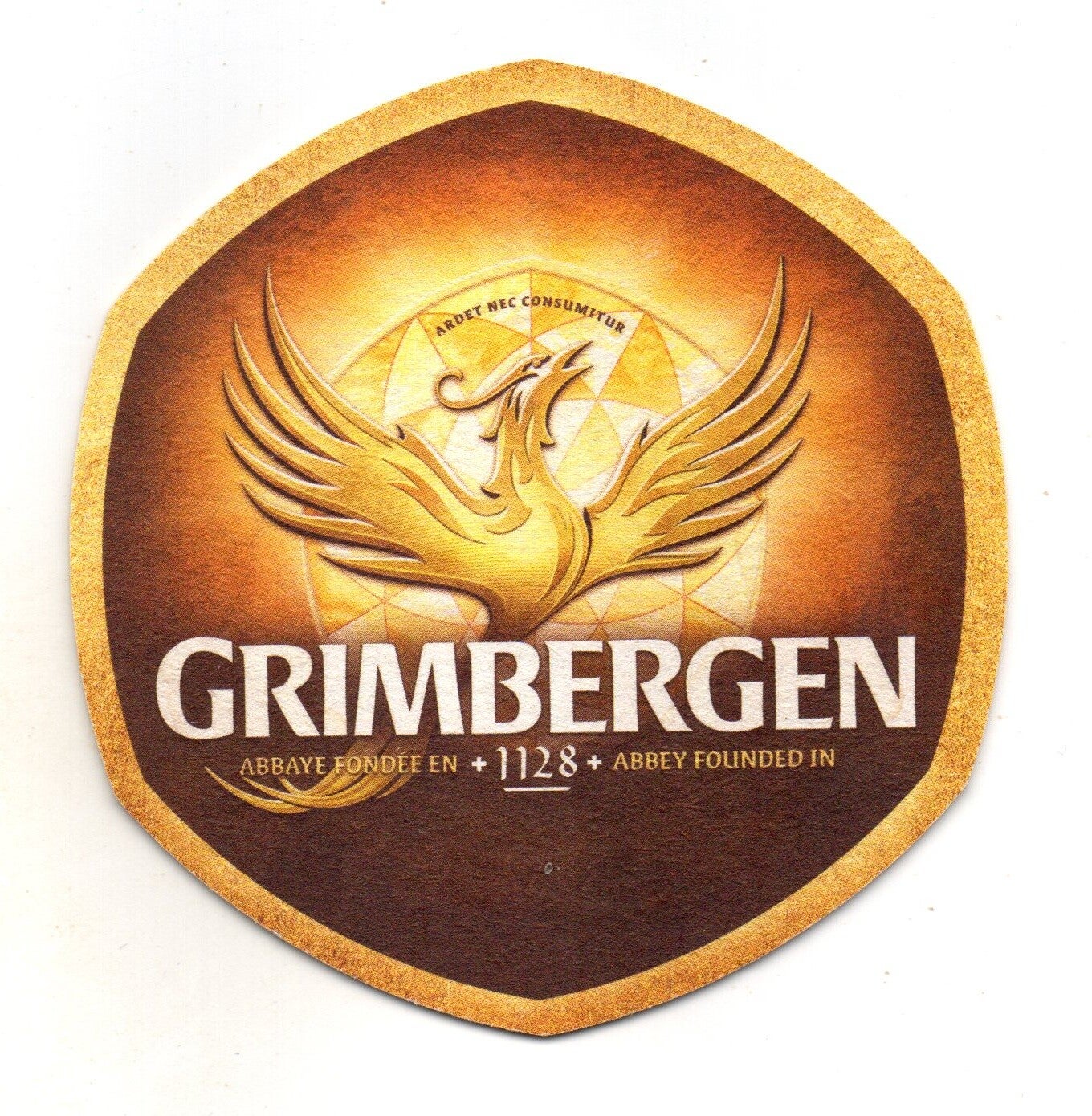Sottobicchiere birra Grimbergen, in cartoncino pressato monouso di forma esagonale. Dimensioni cm 5 per lato.