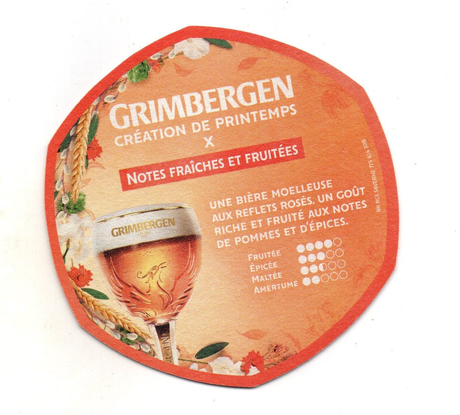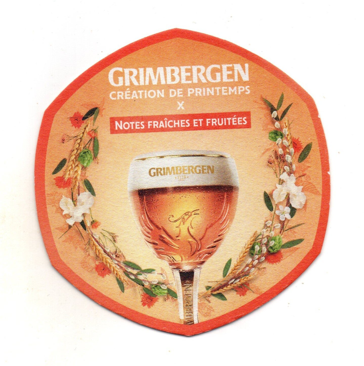 Sottobicchiere birra Grimbergen, in cartoncino pressato monouso di forma esagonale. Dimensioni cm 5 per lato.