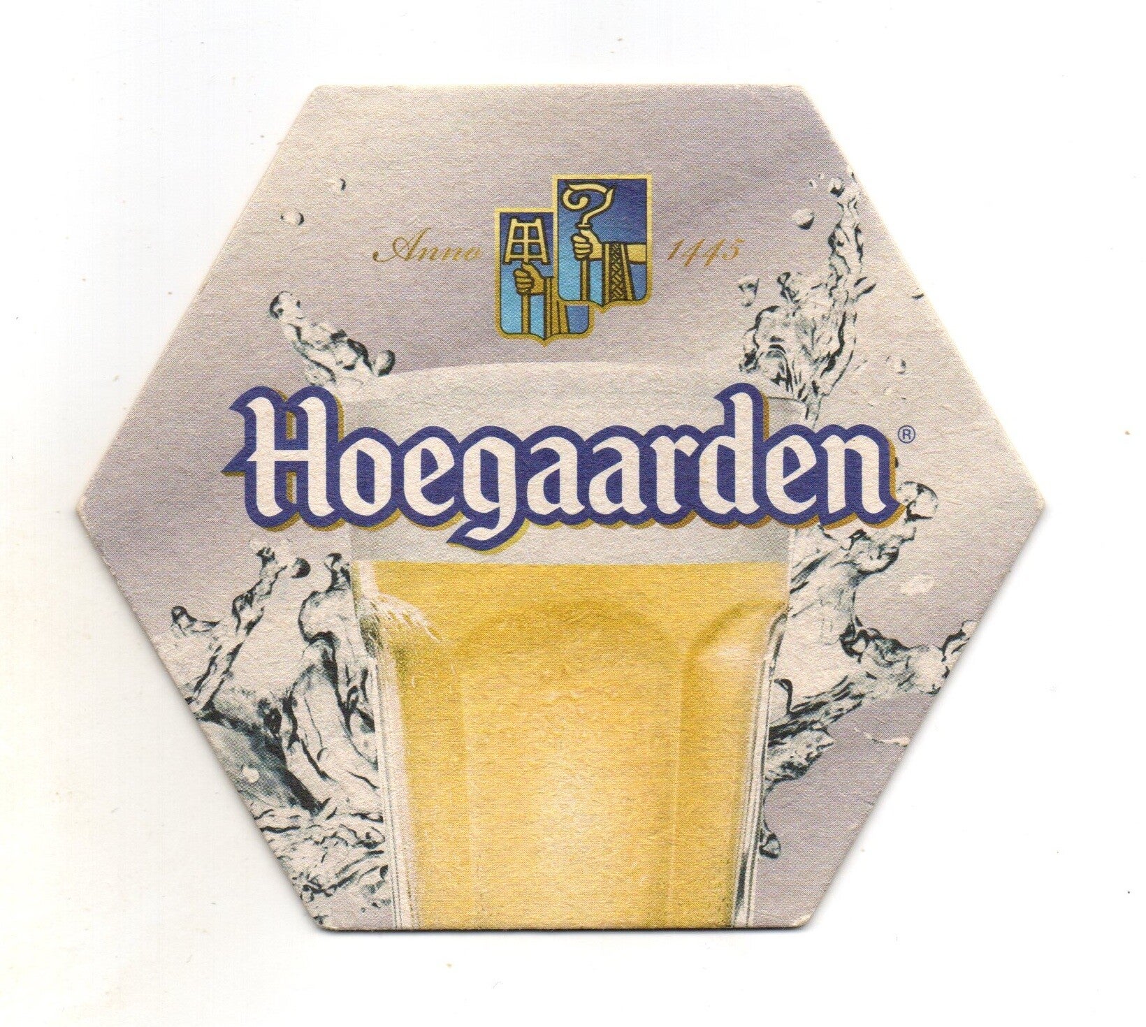 Sottobicchiere birra Hoegaarden, in cartoncino pressato monouso di forma esagonale. Dimensioni cm 6 per lato.