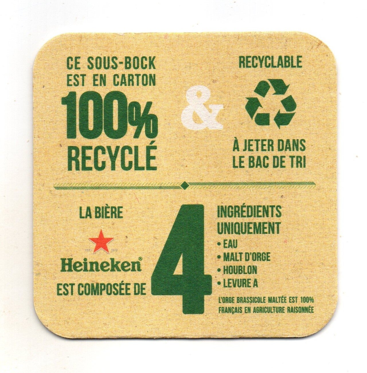 Sottobicchiere birra Heineken, in cartoncino pressato monouso di forma quadrata. Dimensioni cm 9 per lato.