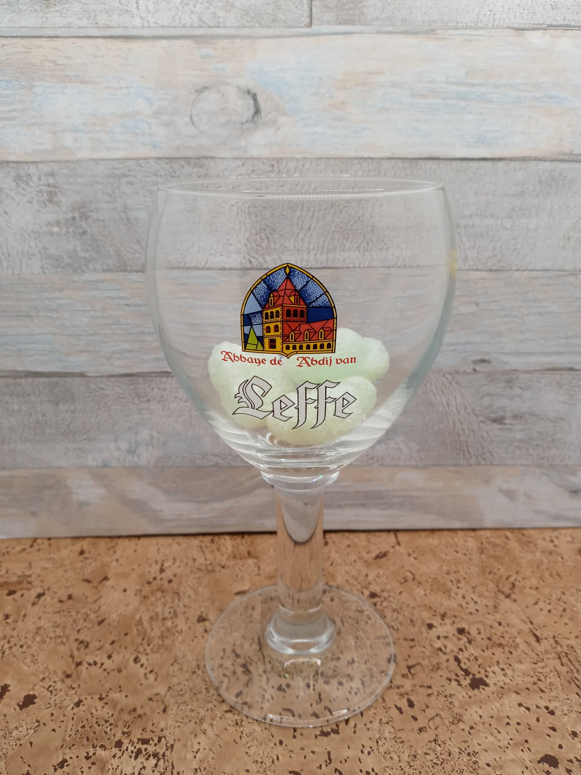 Bicchiere birra Leffe, in vetro dalla tipica forma ad ampio calice della capacità alla tacca di 33 cl. Altezza cm 19. Apertura diametro cm 9. Base cm 8. Sul davanti compare a forma di scudo l'immagine dell'Abbazia con la scritta Abbaye de Abdij van Leffe. Lo stelo è liscio