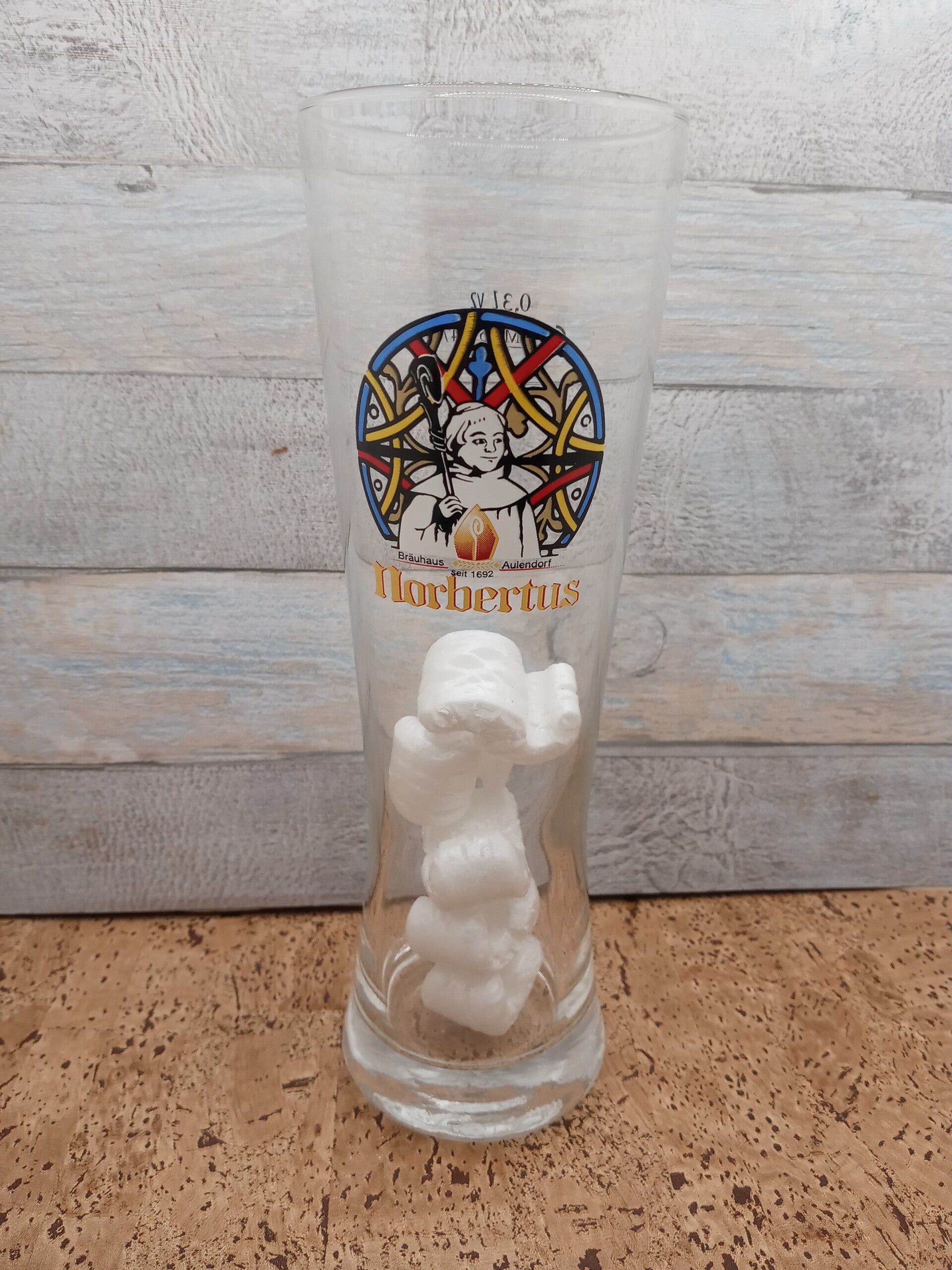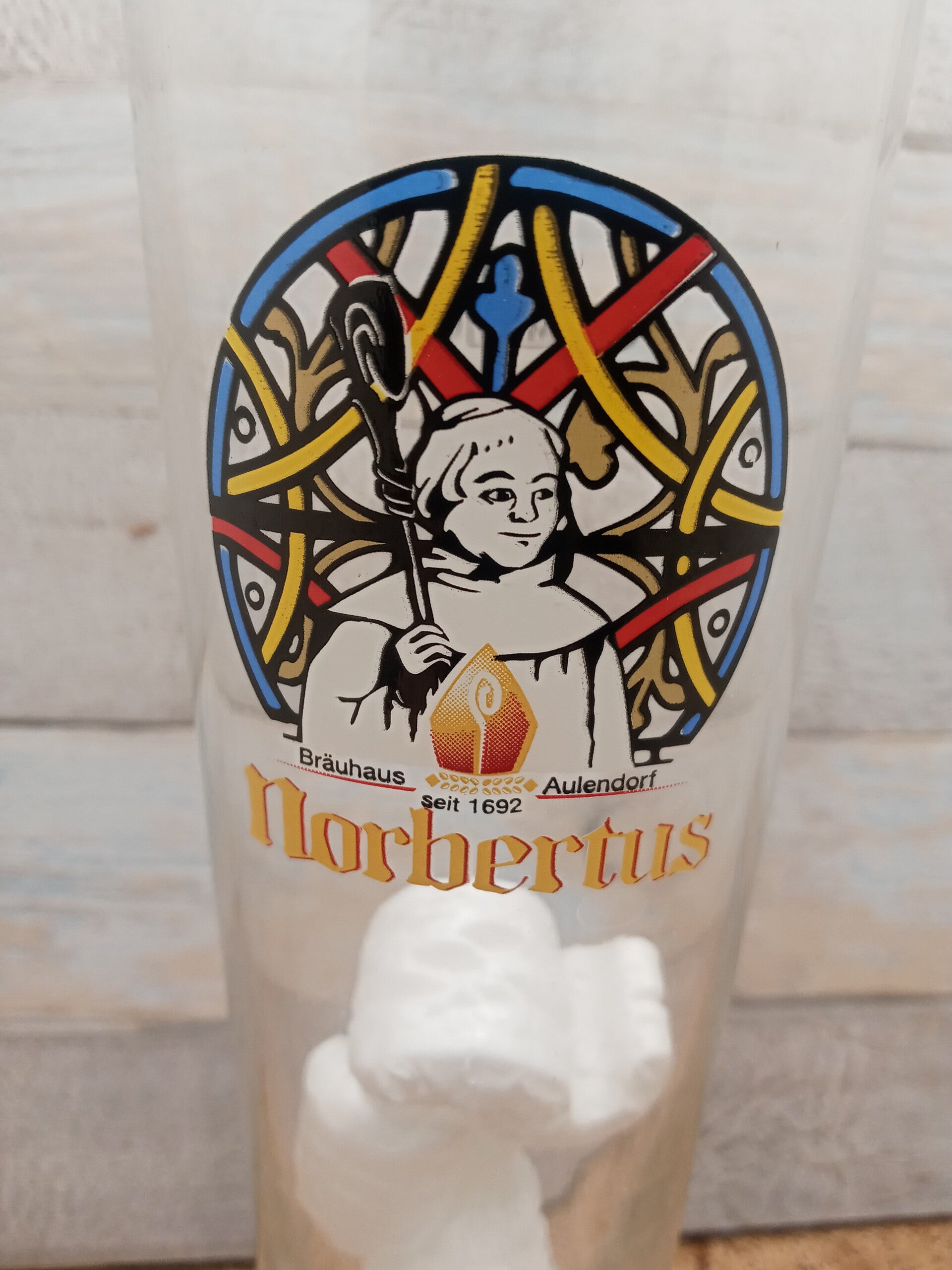 Bicchiere birra Norbertus Brauhaus Aulendorf seit 1692 in vetro a forma tipica weizen svasata tedesca della capacità alla tacca di 30 cl. Altezza cm 21