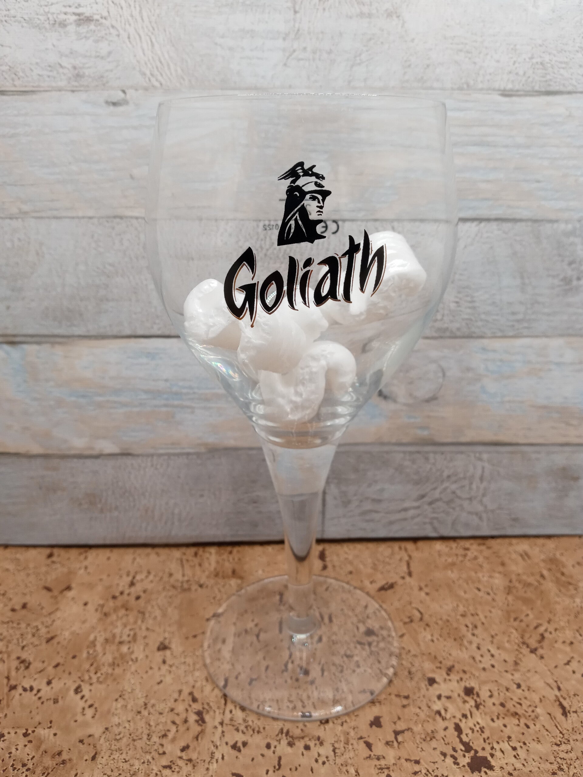 Bicchiere birra Goliath in vetro, calice dallo stelo sottile della capacità di 25 cl. Altezza cm 19,5.