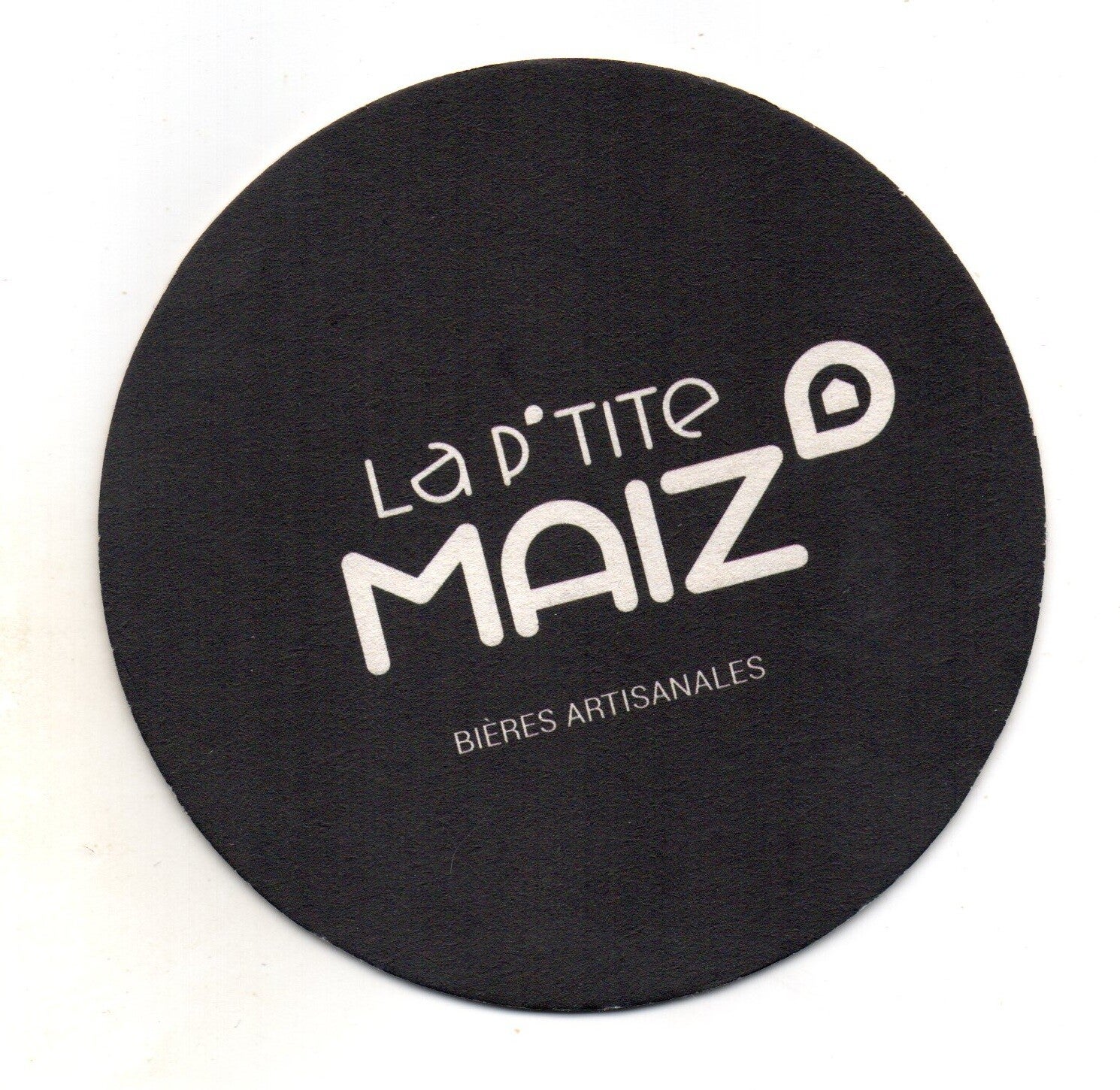 Sottobicchiere birra La P'Tite Maiz bières artisanales, in cartoncino pressato monouso di forma rotonda. Diametro cm 11.
