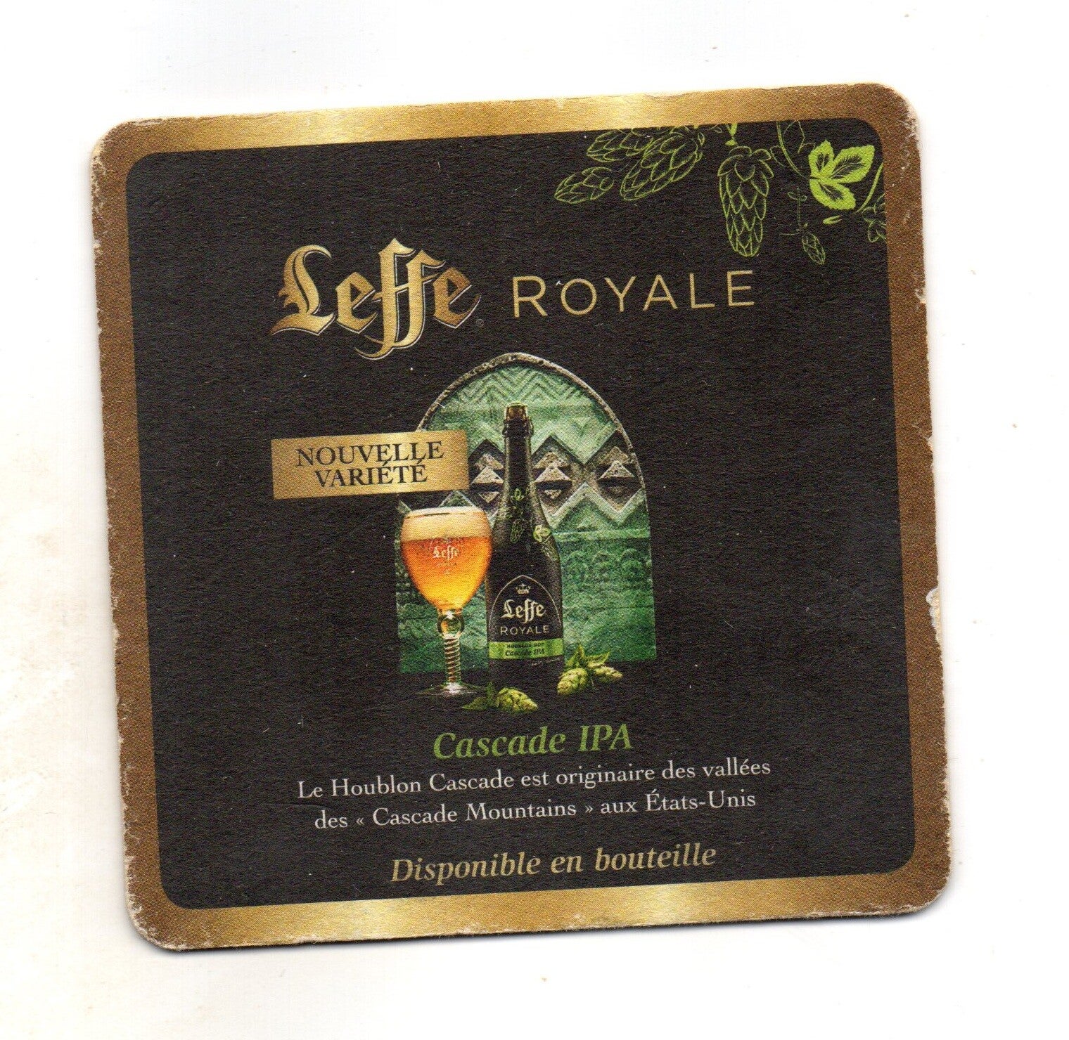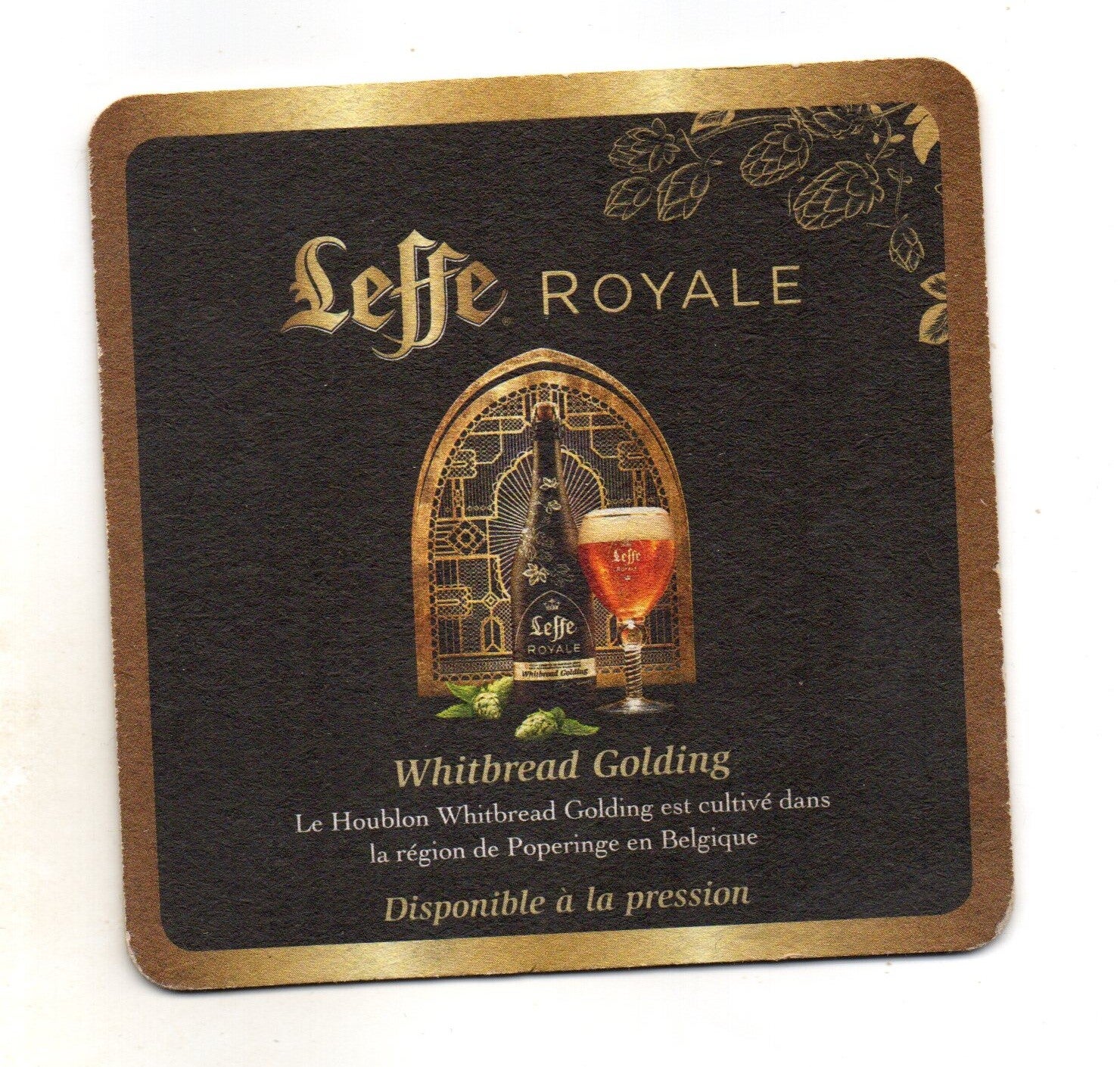 Sottobicchiere birra Leffe Royale, in cartoncino pressato monouso di forma quadrata. Dimensioni cm 10 per lato.