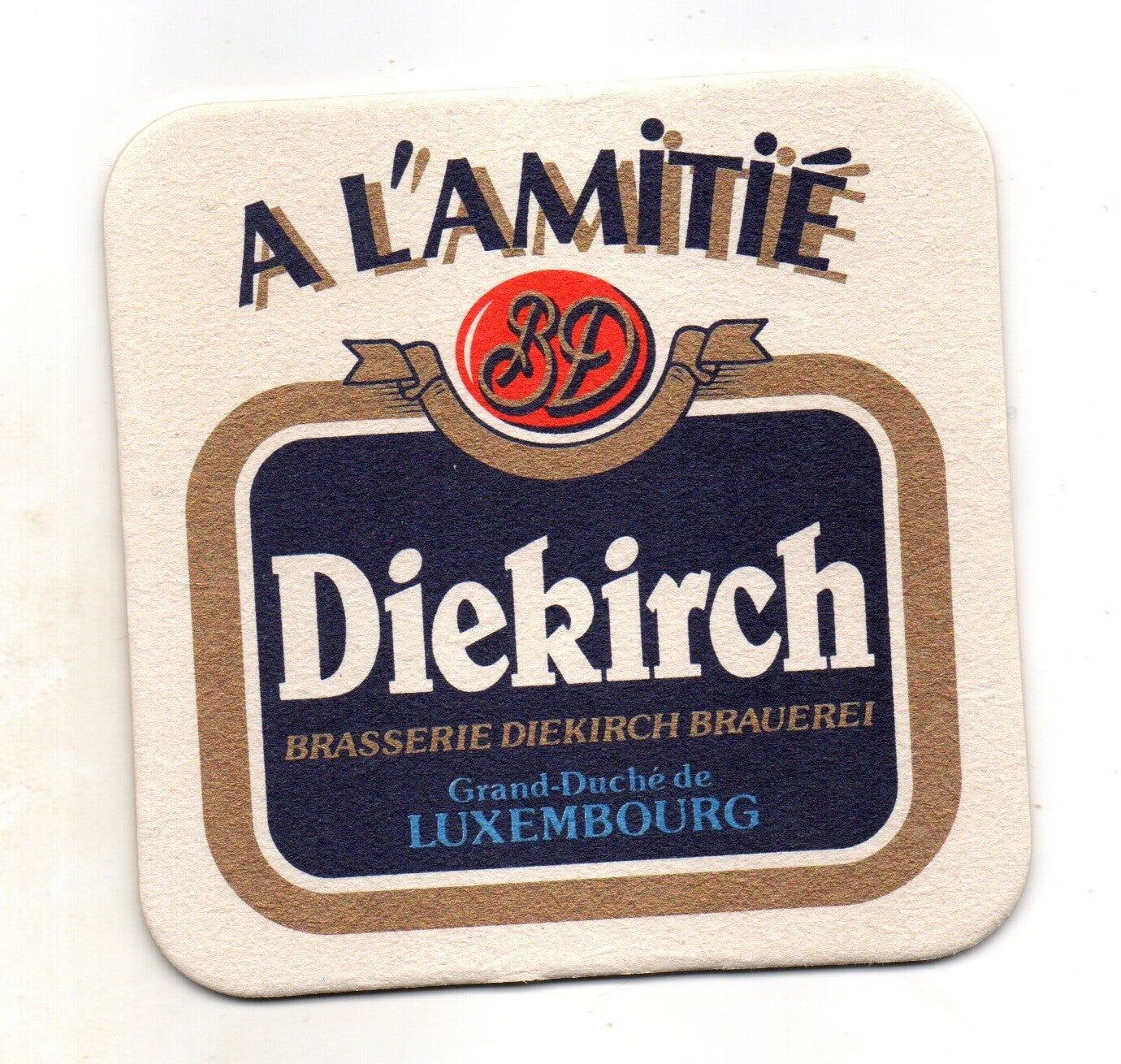 Sottobicchiere birra Diekirch, in cartoncino pressato monouso di forma quadrata. Dimensioni cm 9,5 per lato.