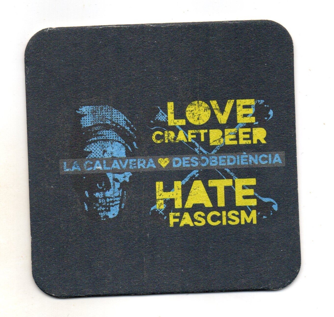 Sottobicchiere birra La Calavera, in cartoncino pressato monouso di forma quadrata. Dimensioni cm 9,5 per lato.