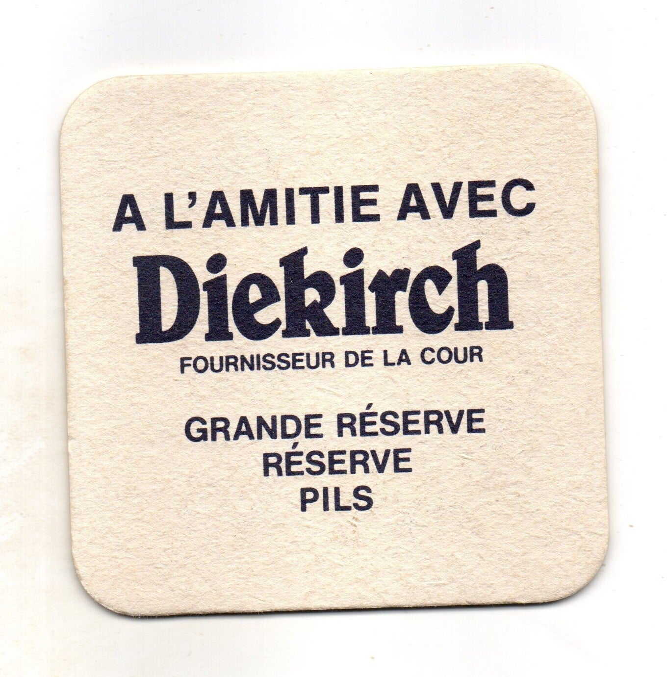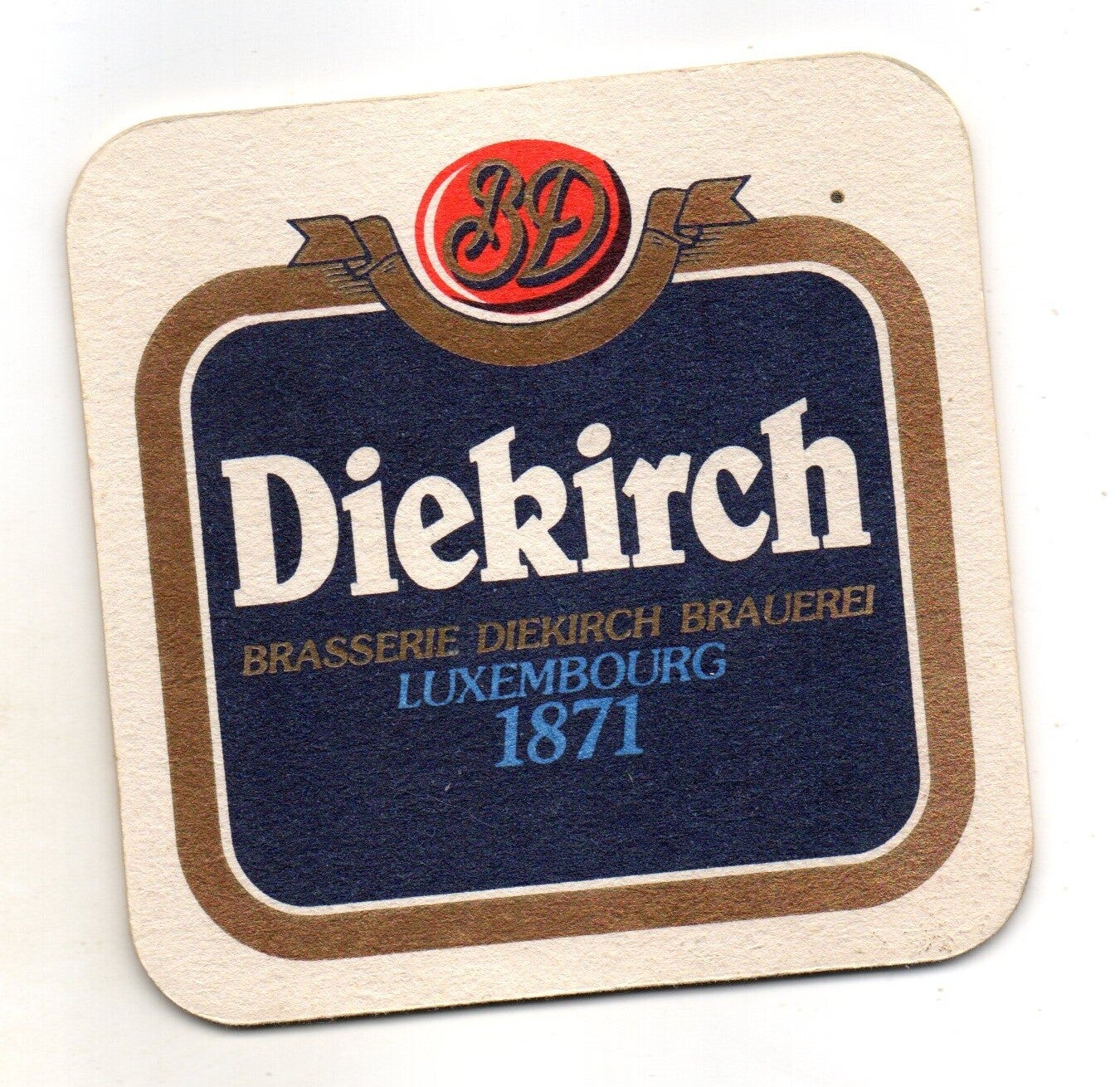 Sottobicchiere birra Diekirch, in cartoncino pressato monouso di forma quadrata. Dimensioni cm 9,5 per lato.