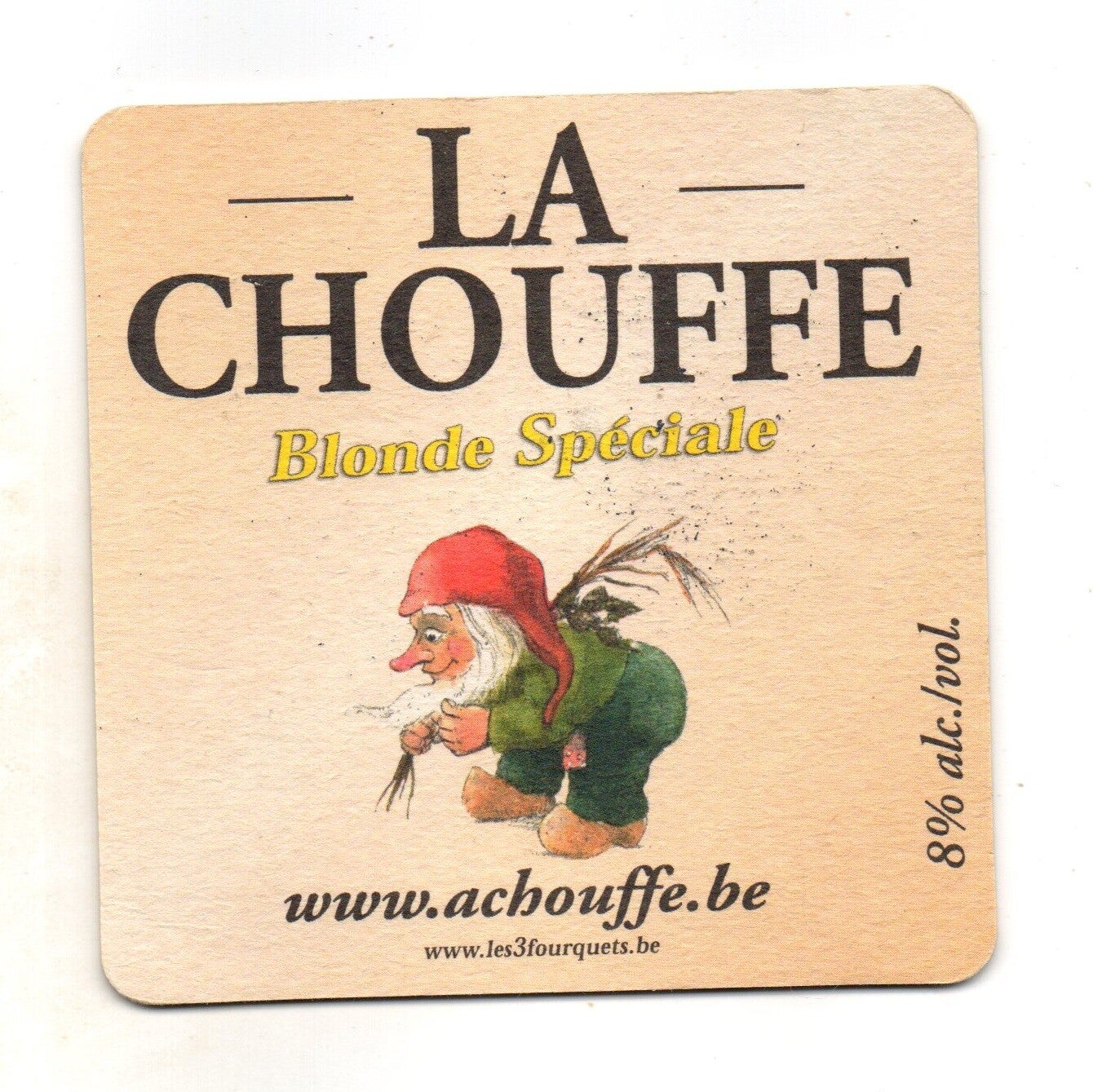 Sottobicchiere birra Chouffe, in cartoncino pressato monouso di forma quadrata. Dimensioni cm 9,5 per lato.