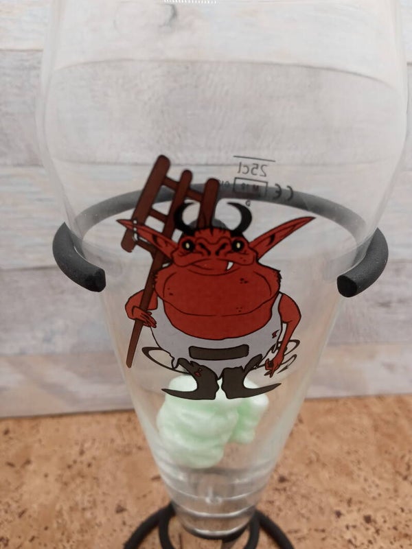Sul bicchiere è raffigurato un simpatico diavoletto, predecessore dei "Duvel".