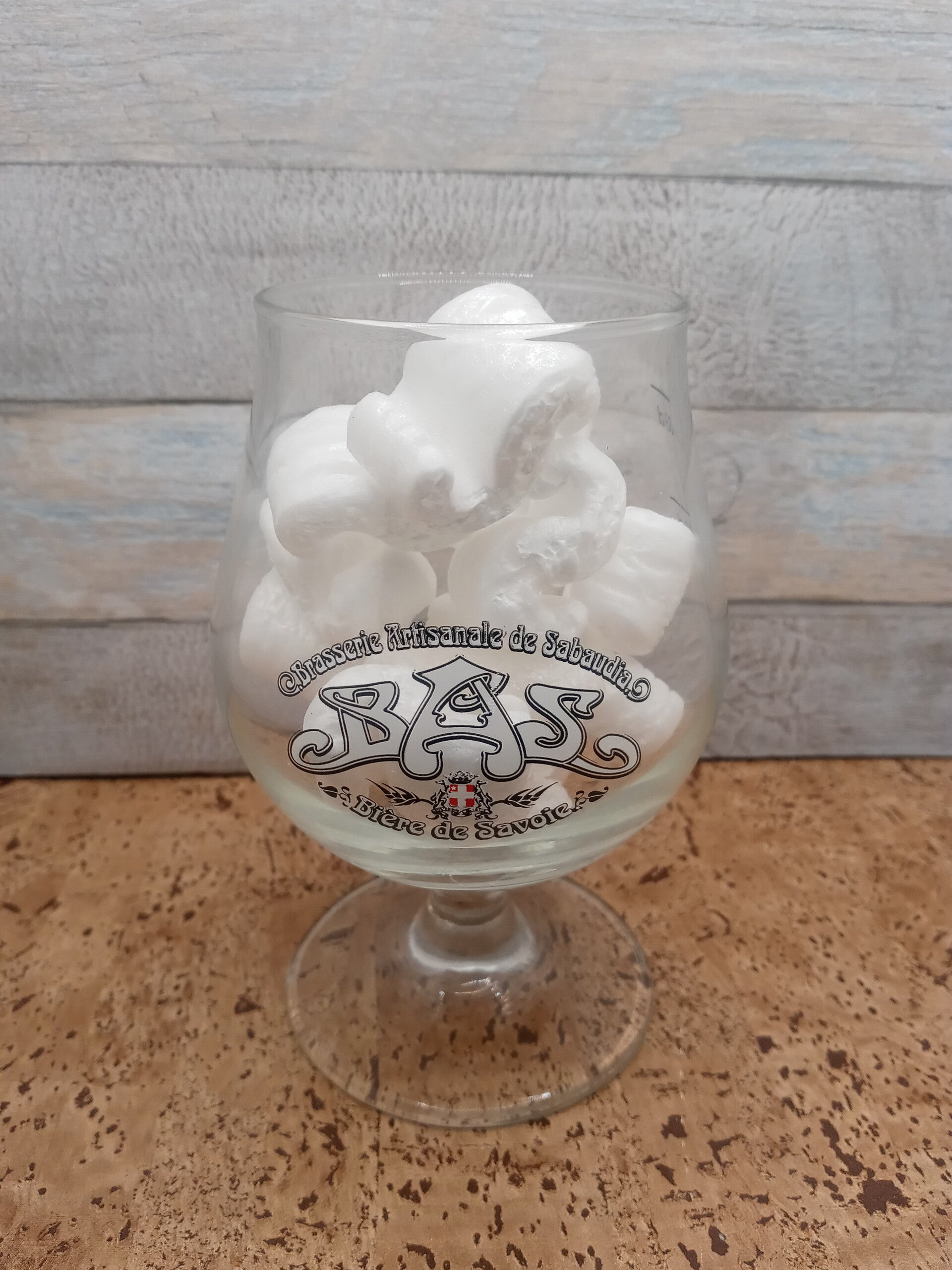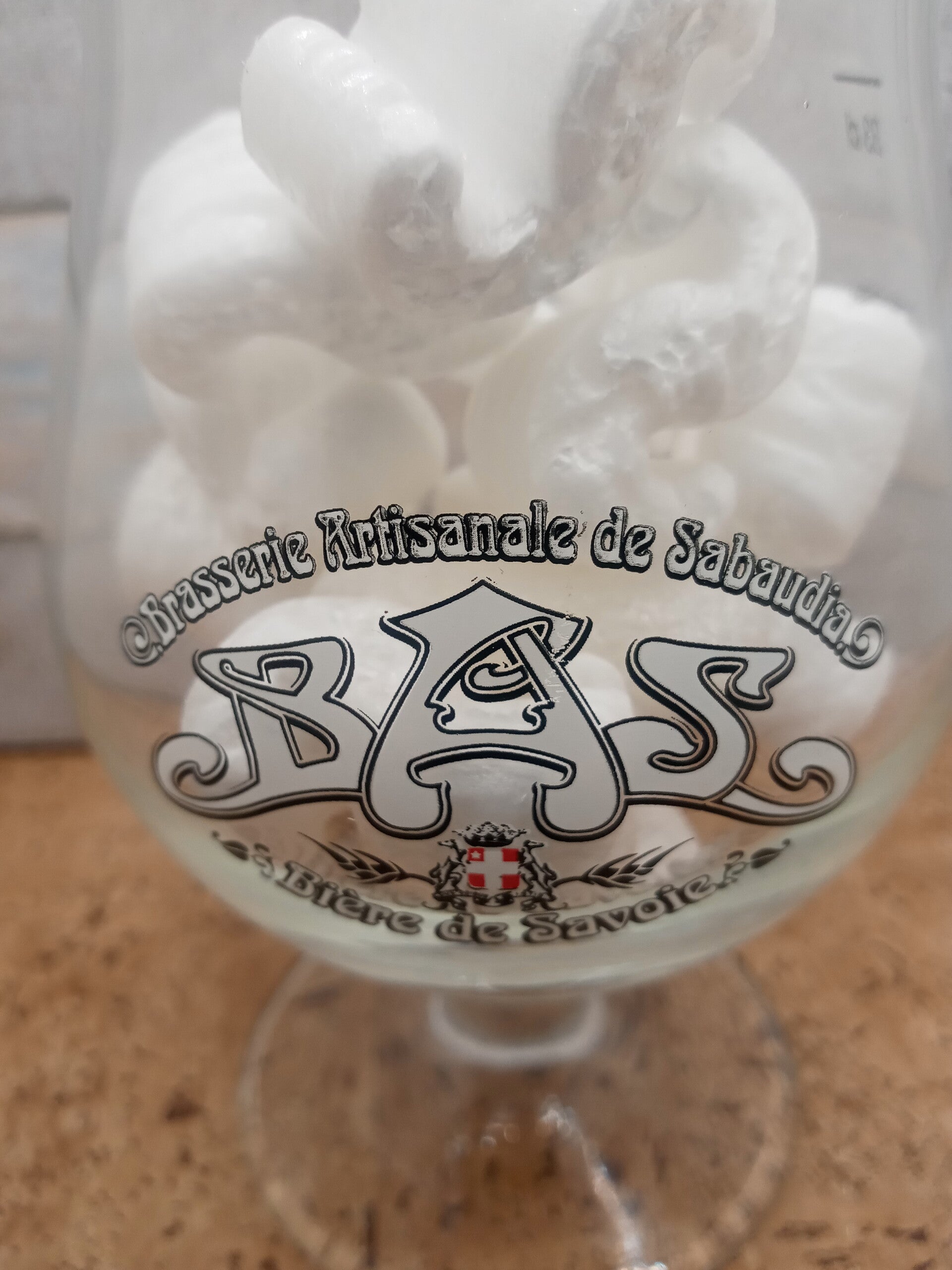 Bicchiere birra BAS Brasserie Artisanale de Sabaudia in vetro, calice dalla forma di piccola coppa della capacità massima alla tacca di 33 cl. Altezza cm 14. Diametro apertura cm 6,5. Diametro base cm 7,5.