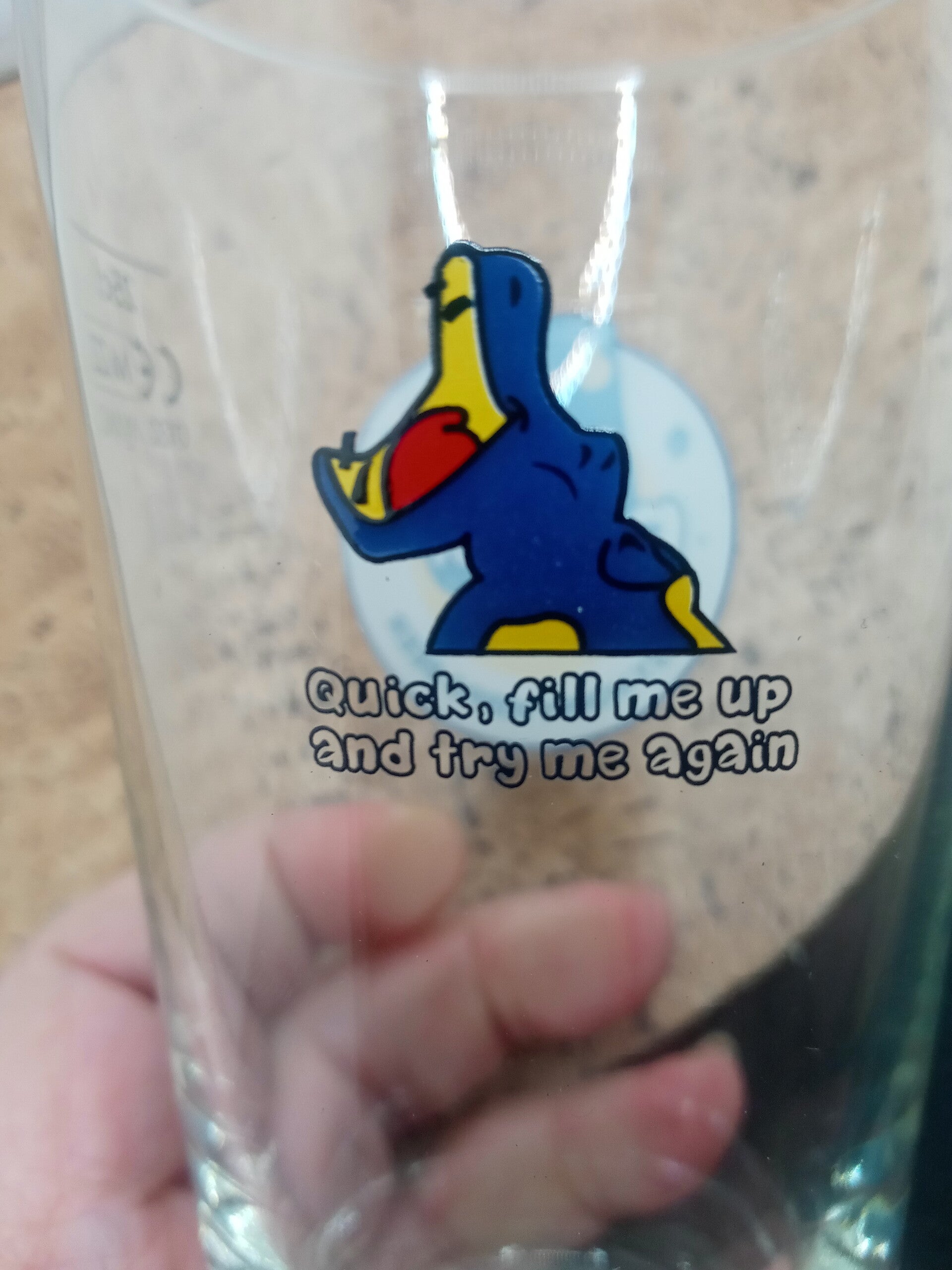 Sul retro del bicchiere compare la scritta "Quick fill me up, and try me again".
