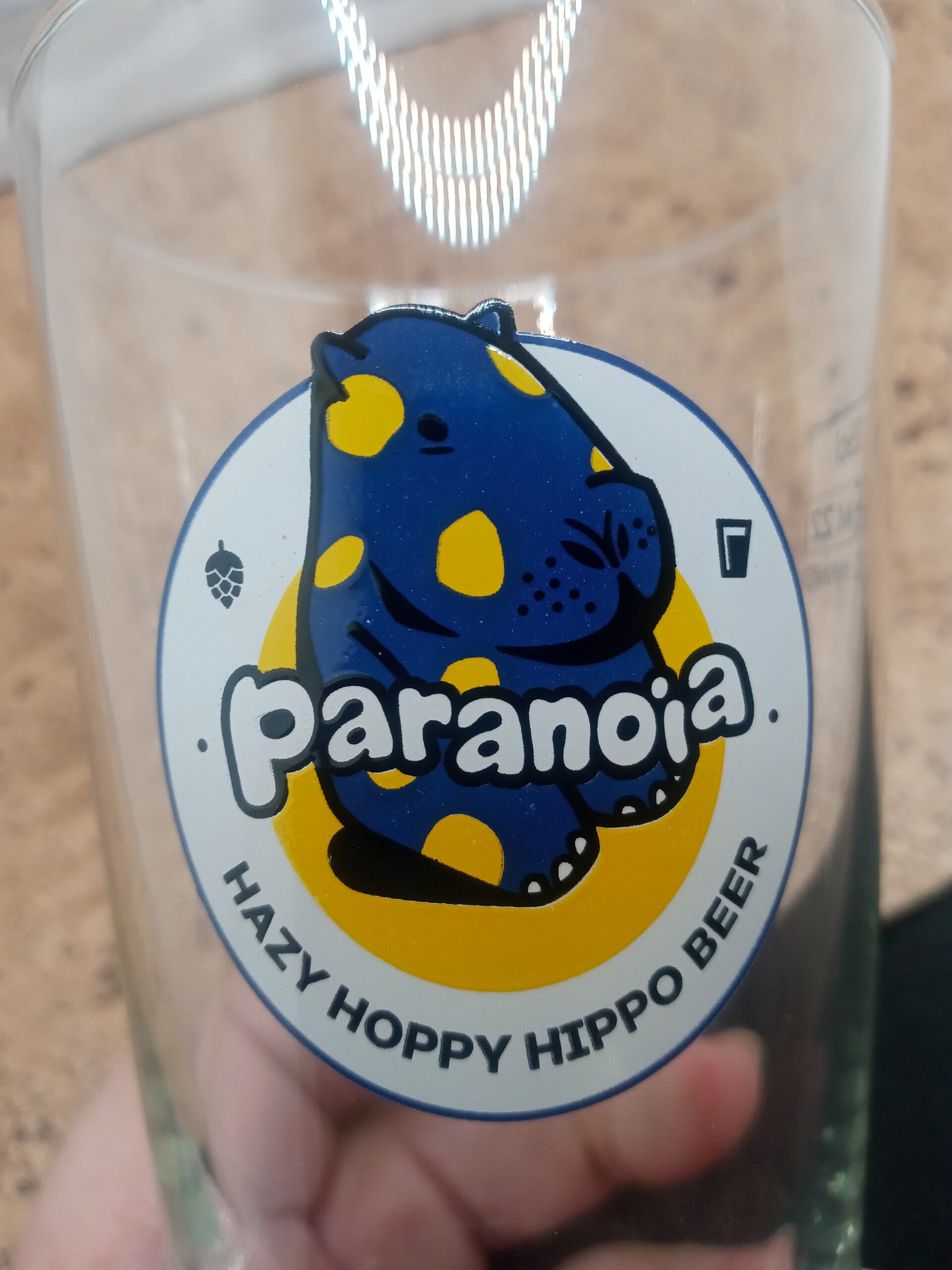 Bicchiere birra Paranoia Hazy Hoppy Hippo Beer, tumbler in vetro Ayano della capacità alla tacca di 25 cl. Altezza cm 13,5.