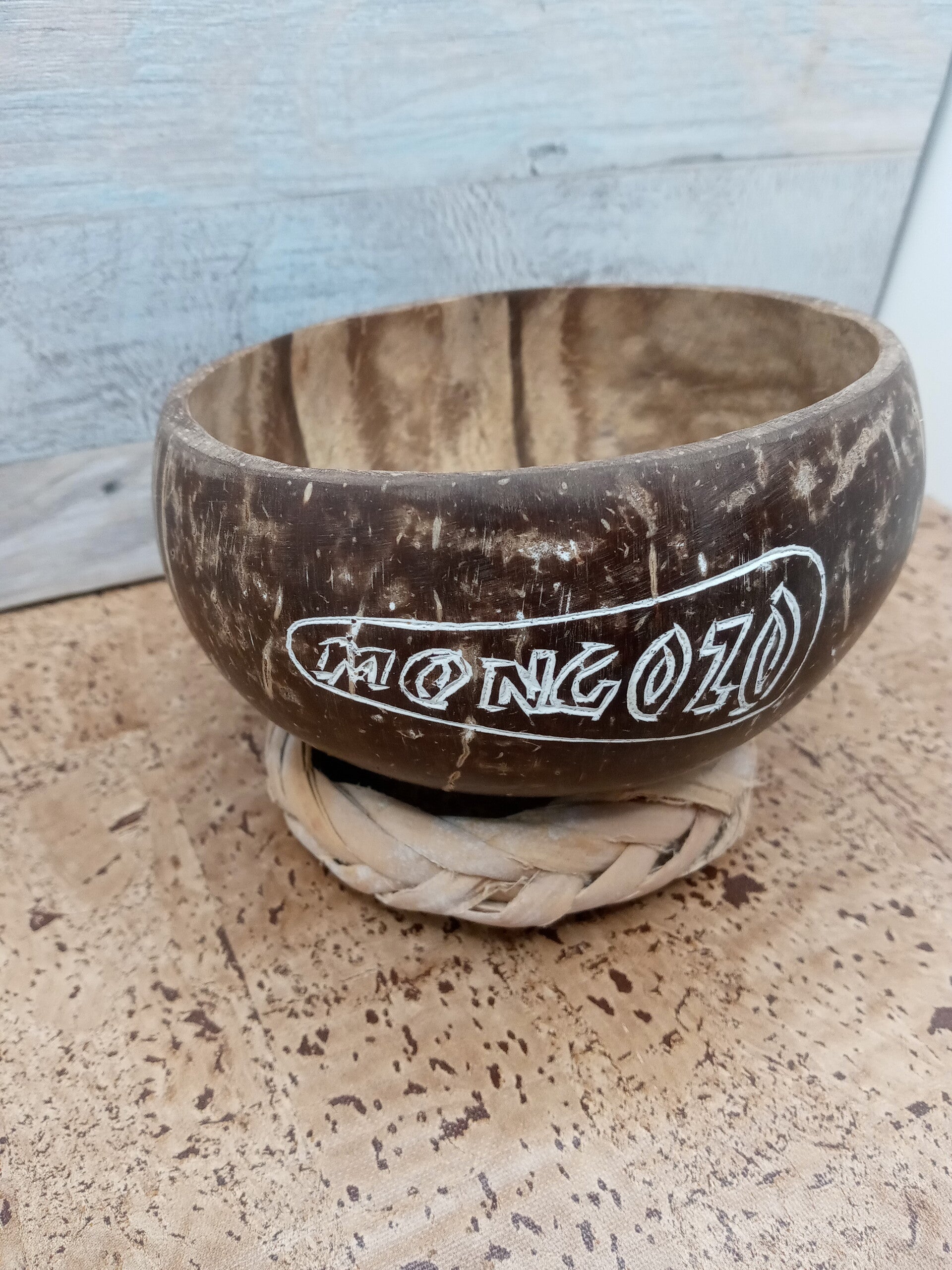 Bicchiere birra Mongozo Coconut a forma di mezza noce di cocco con base di appoggio in raffia intrecciata della capacità di 33 cl. Altezza cm 9,5 (appoggio compreso). Diametro apertura cm 11. La base di appoggio misura cm 9 di diametro e cm 2 di altezza.