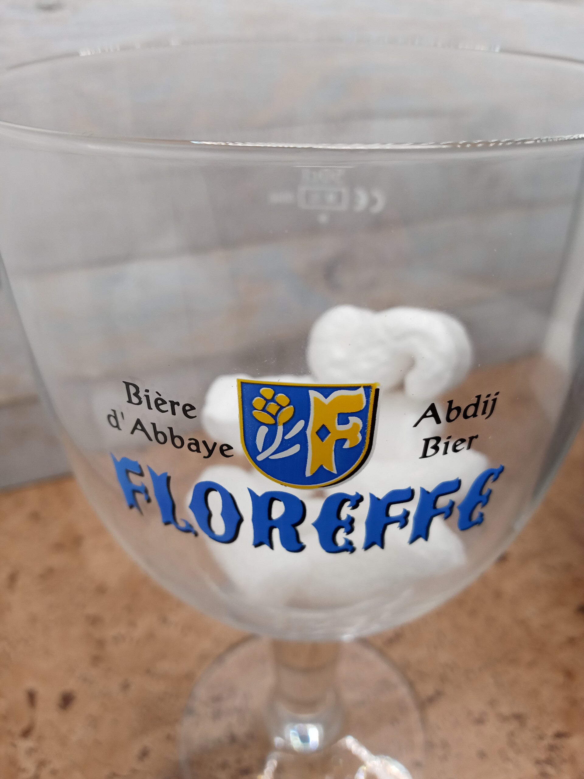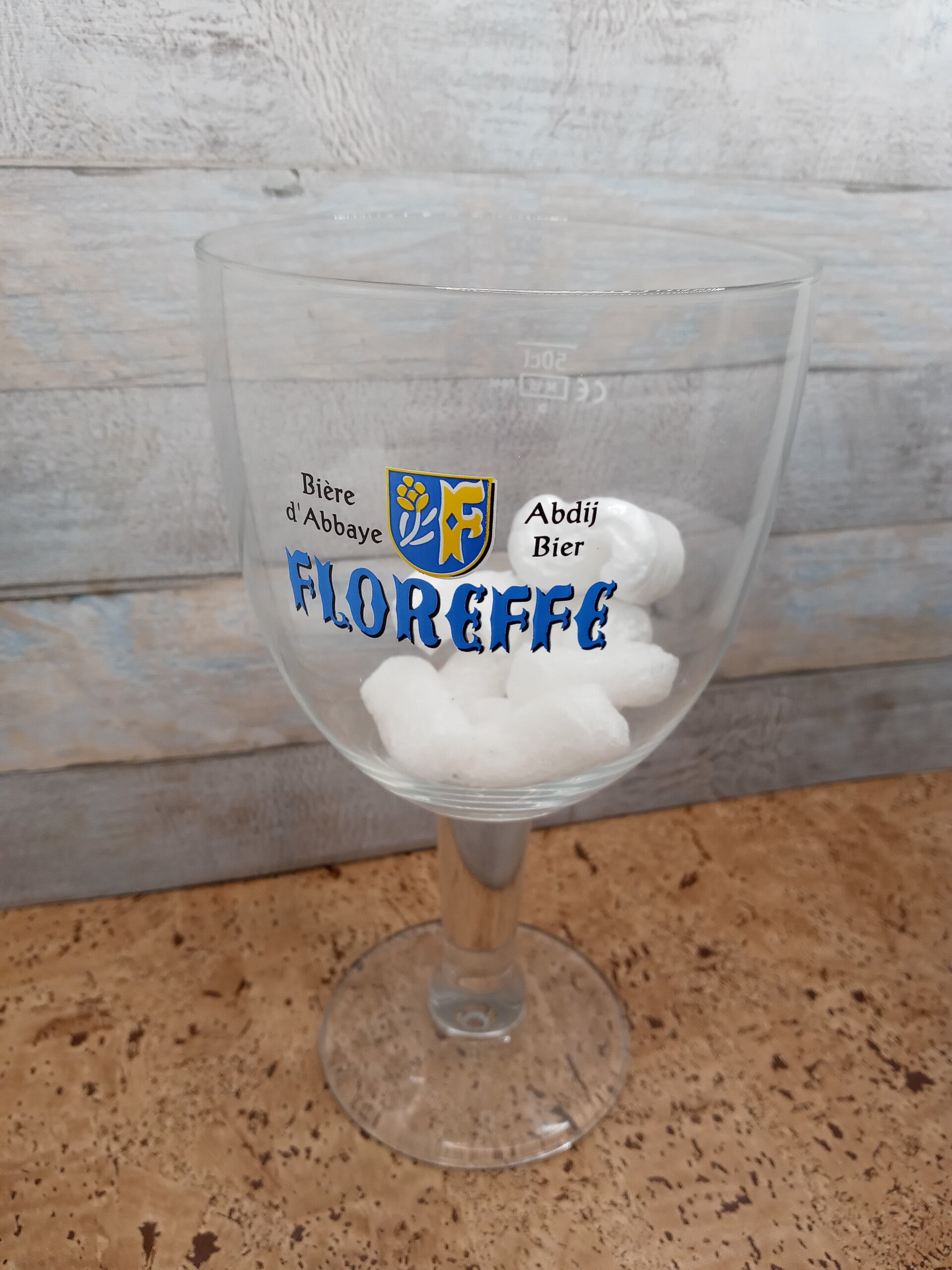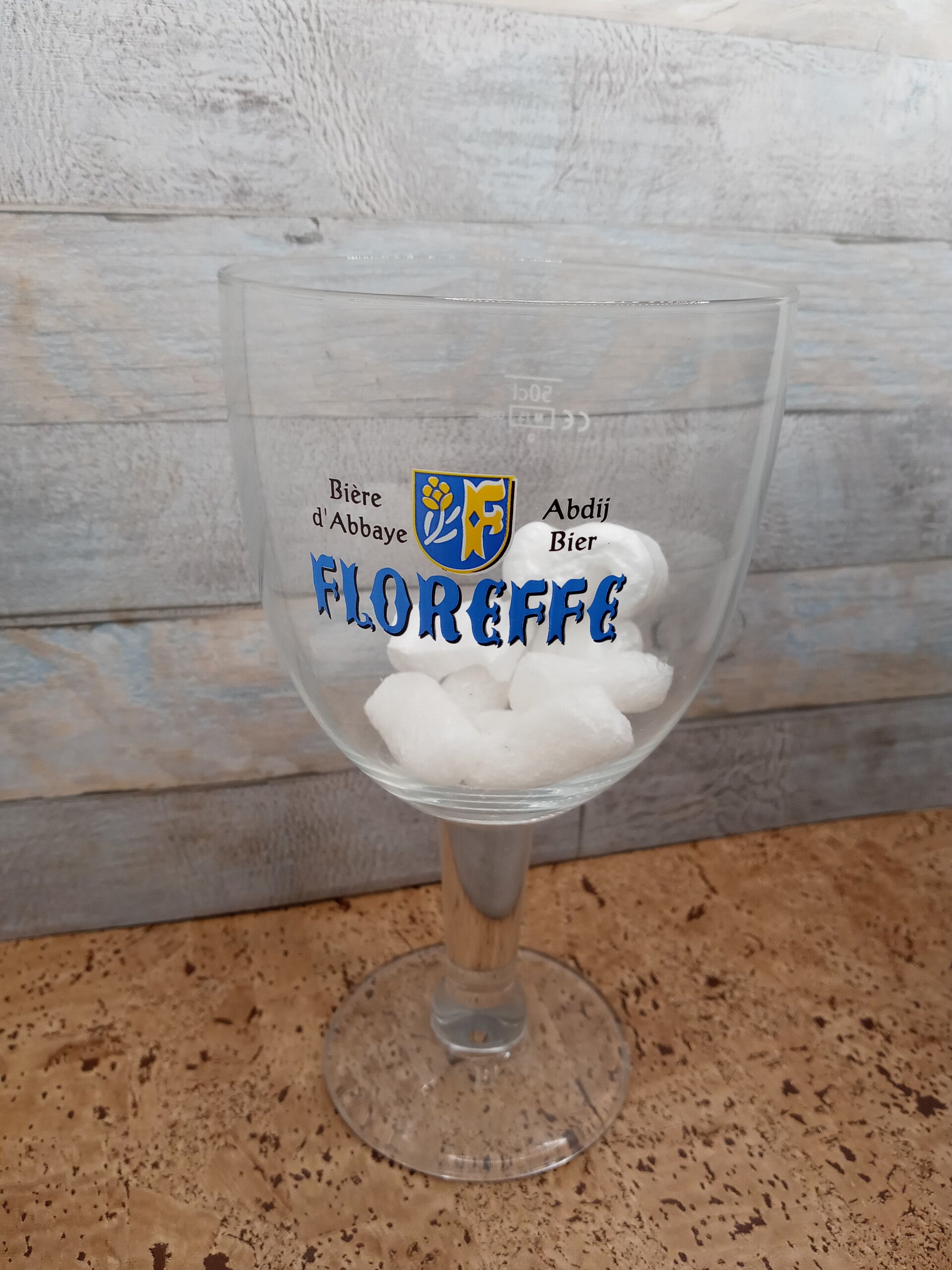 Bicchiere birra Floreffe bière d'Abbaye - Abdij bier in vetro, calice a forma di grande coppa della capacità alla tacca di 50 cl. Stelo robusto. Altezza cm 20. Diametro apertura cm 11. Diametro base cm 8.