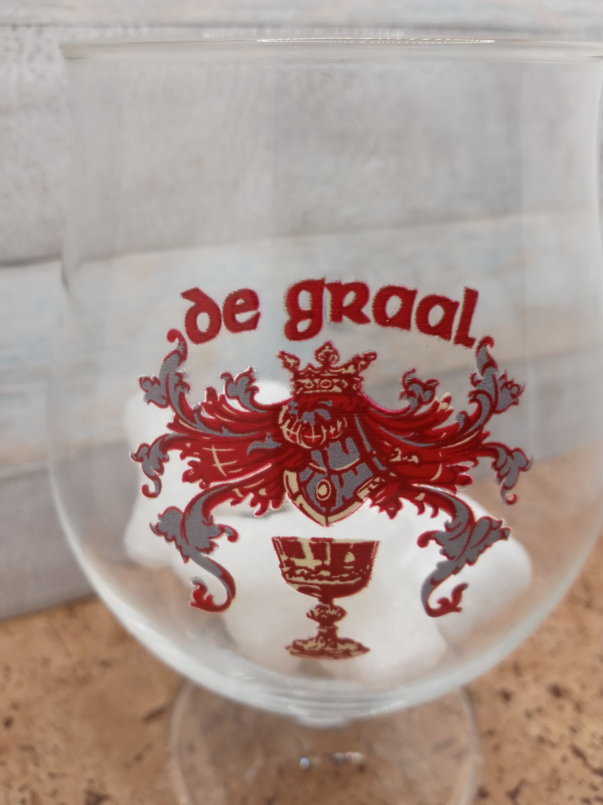 Bicchiere birra De Graal in vetro Ritzenhoff, calice a forma di coppa a chiudere della capacità alla tacca di 33 cl. Altezza cm 15. Diametro apertura cm 7. Diametro base cm 7,5.