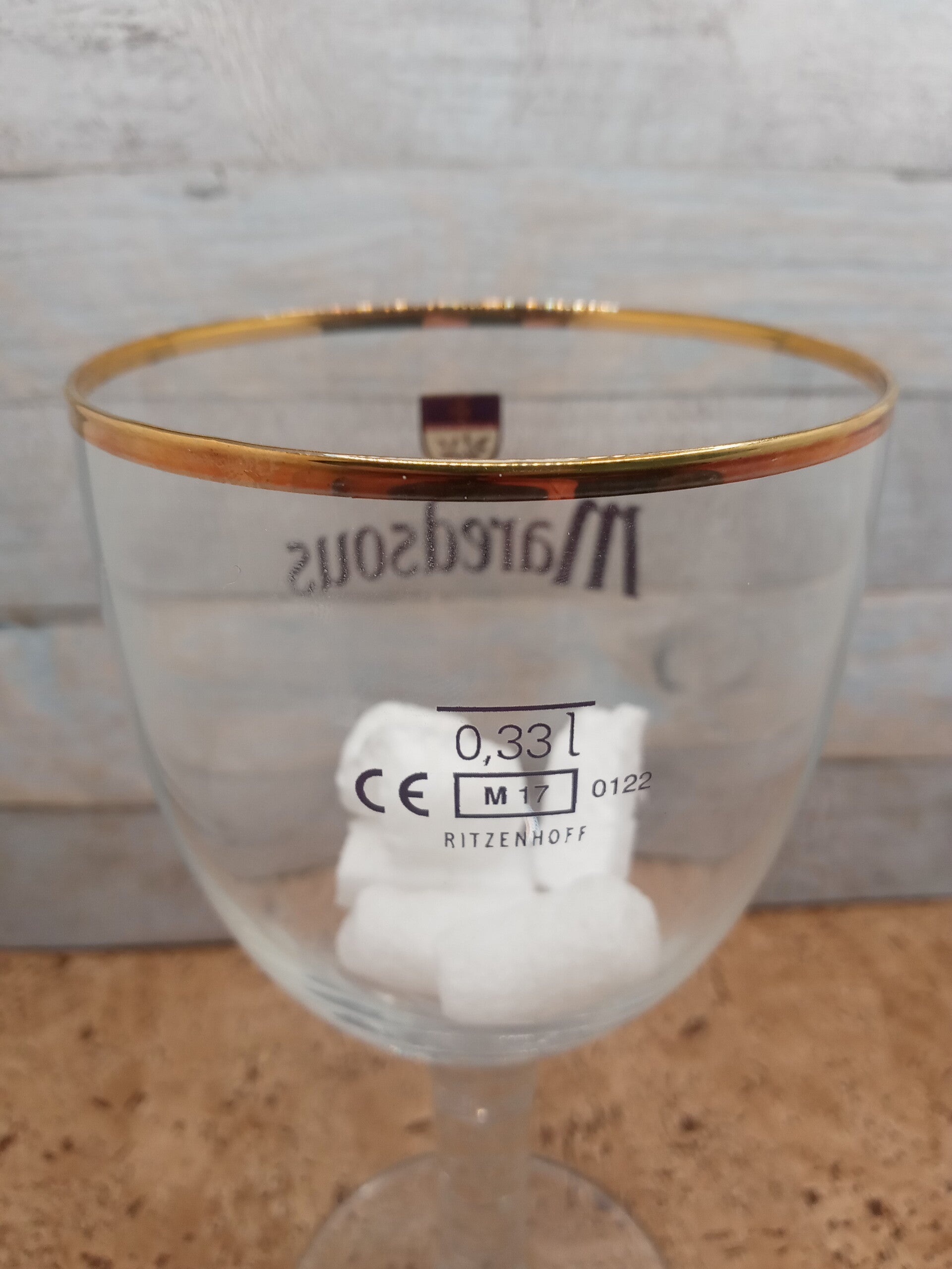 Bicchiere birra Maredsous Abbaye - Abdij in vetro Ritzenhoff, calice dalla forma a grande coppa con bordo dorato della capacità alla tacca di 33 cl. Altezza cm 19. Diametro apertura cm 9,5. Diametro base cm 8.