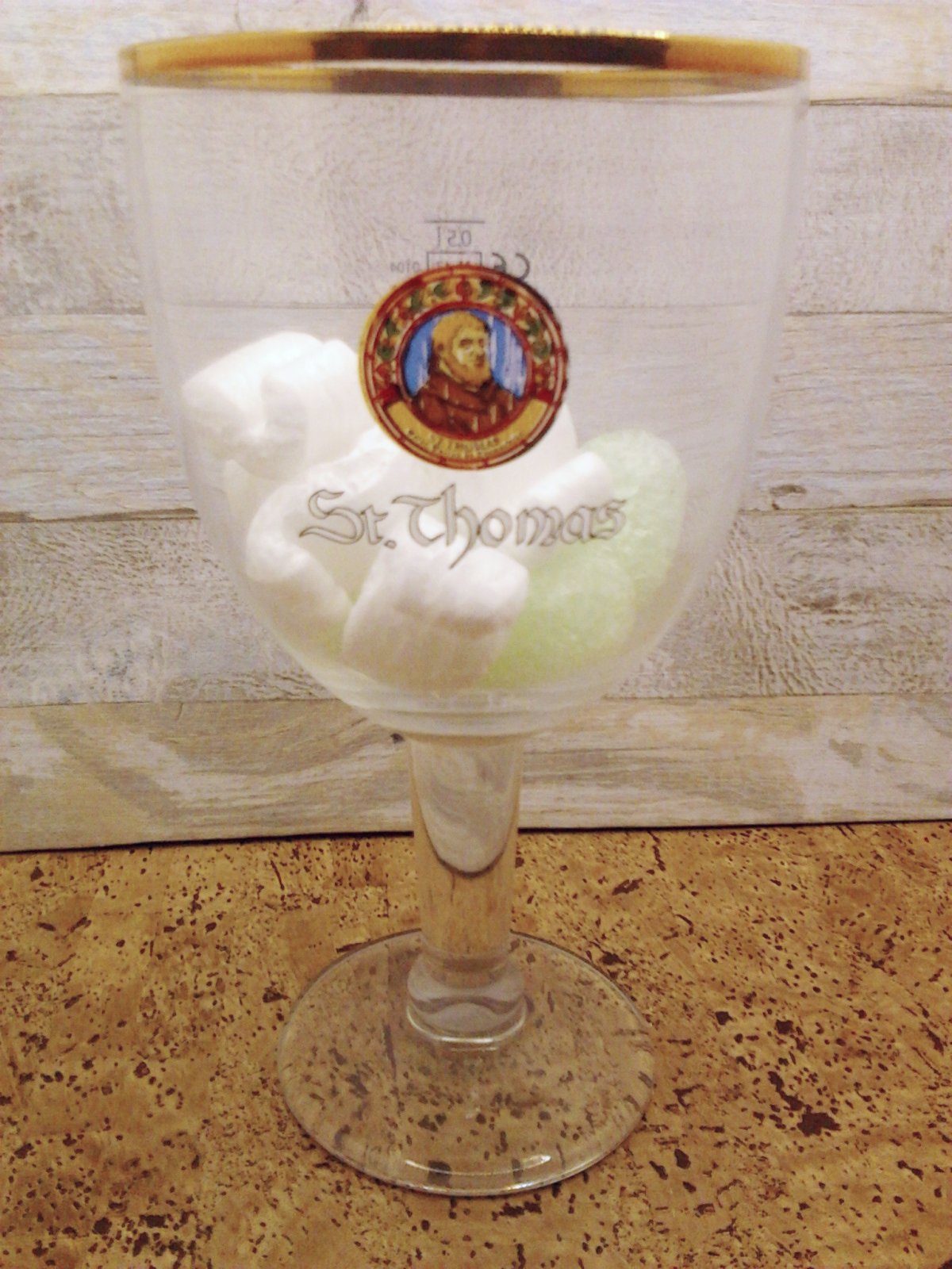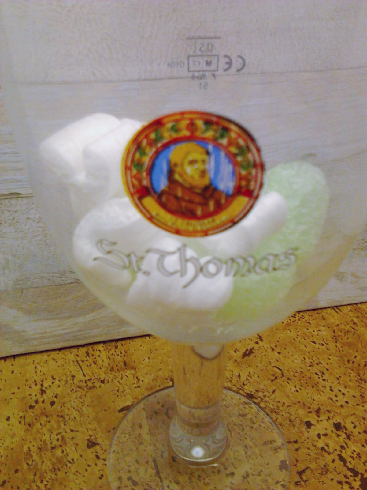 Bicchiere birra St. Thomas, Saint Patron de Thomasbrau, in vetro F. Herb 51, calice a forma di grande coppa della capacità alla tacca di 50 cl. Stelo e base robusti. Bordo dorato. Altezza cm 20. Diametro apertura cm 11. Diametro base cm 8.