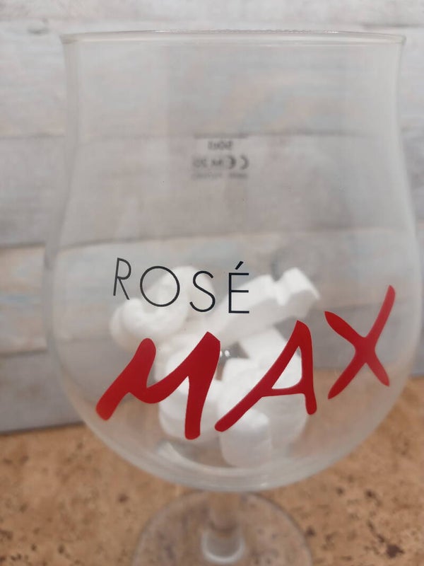 Bicchiere birra Max Rosè, calice in vetro Ayano a forma di ampia coppa della capacità alla tacca di 50 cl. Altezza cm 19,5. Diametro apertura cm 7,5. Diametro base cm 7,5.