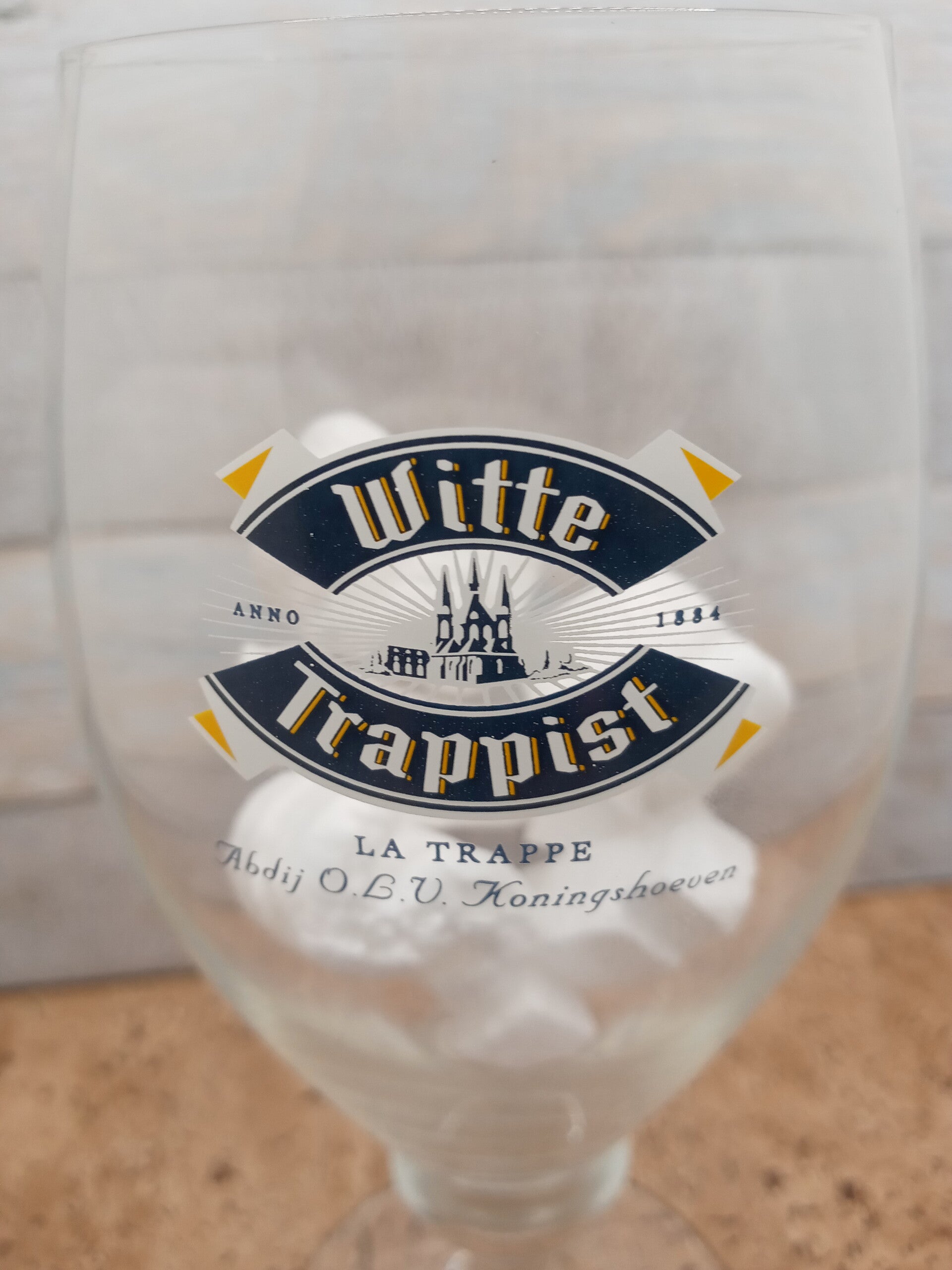 Bicchiere birra La Trappe Trappist Witte anno 1884 Abdij O.B.V. Koningshoeven in vetro RC, classico calice dalla forma retrò con stelo lavorato della capacità alla tacca di 30 cl. Altezza cm 19. Diametro apertura cm 6. Diametro base cm 8.