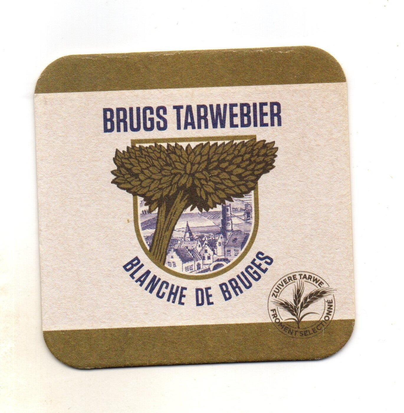 Sottobicchiere birra Brugs Tarwebier, in cartoncino pressato monouso di forma quadrata. Dimensioni cm 9 per lato.